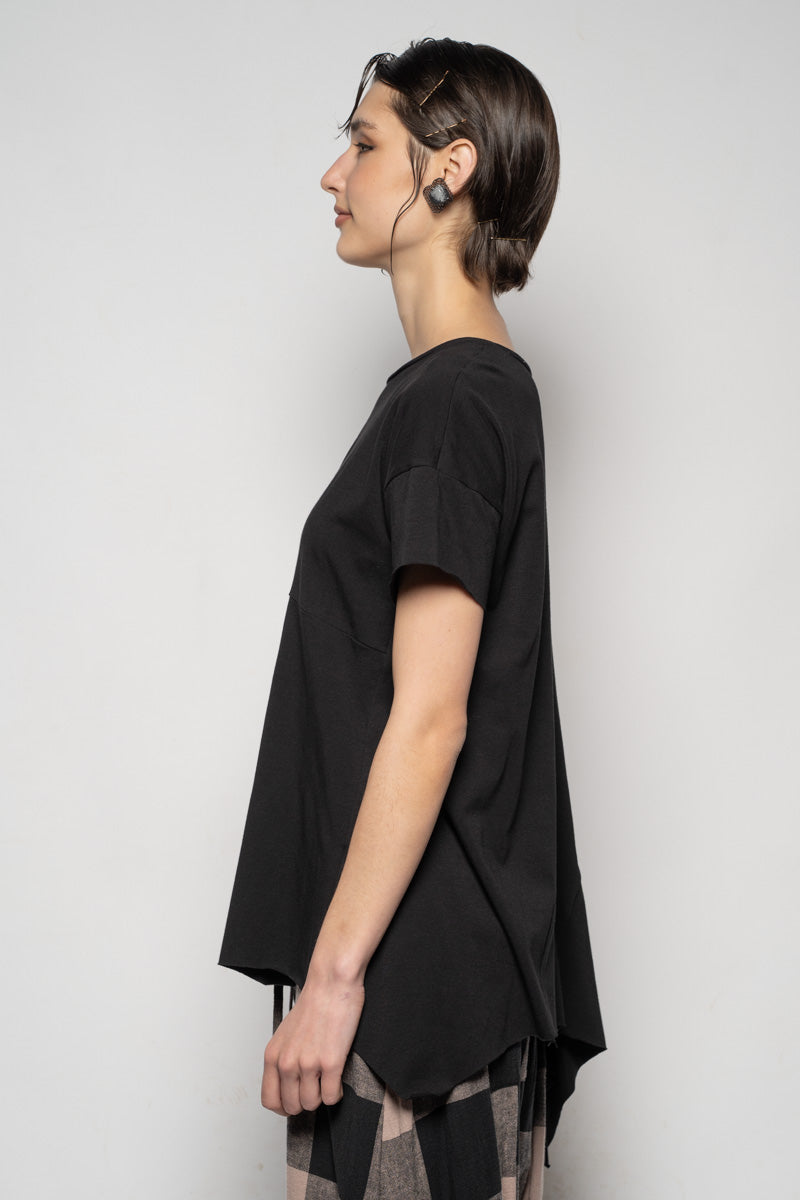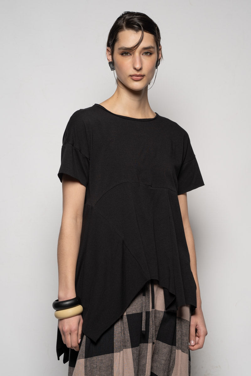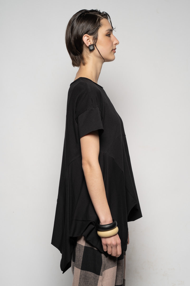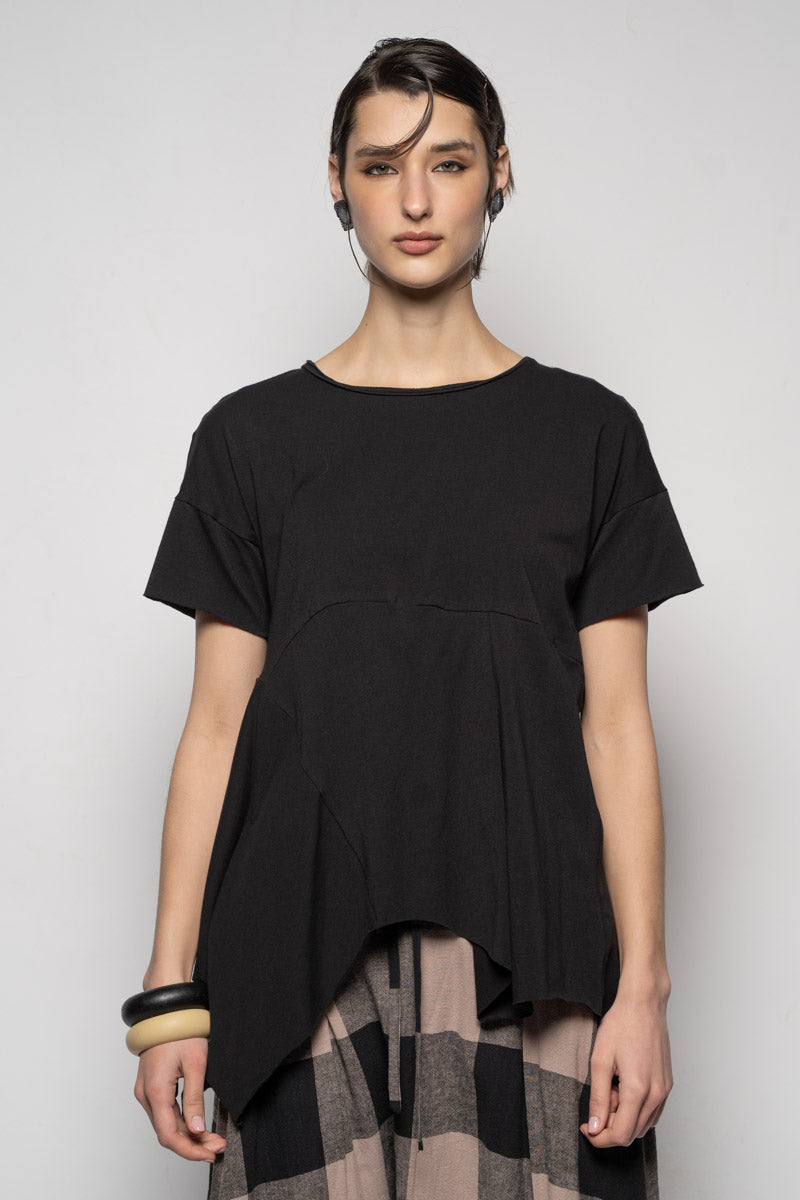 A refined take on the classic tee, the Banka Top distills everyday ease into a clean, architectural form. Cut from breathable cotton with a hint of spandex, it falls into an effortless drape, defined by its asymmetrical hem and subtle panel details.
