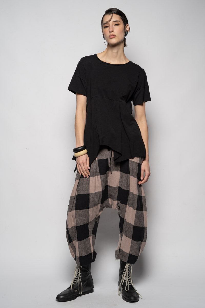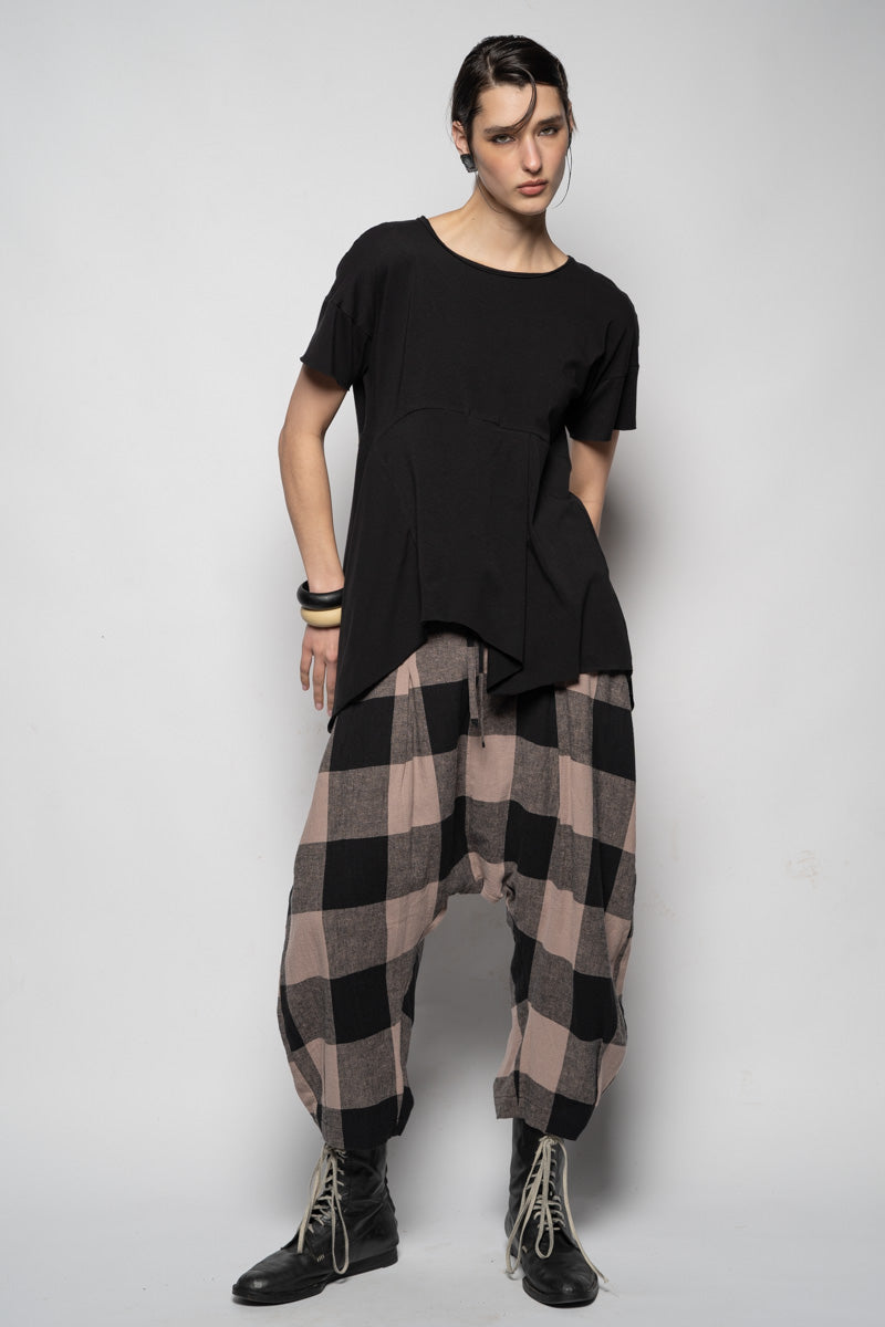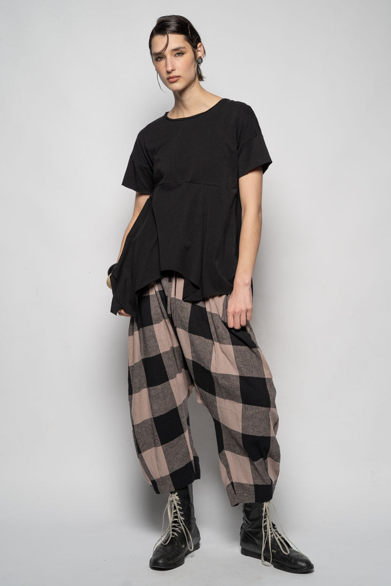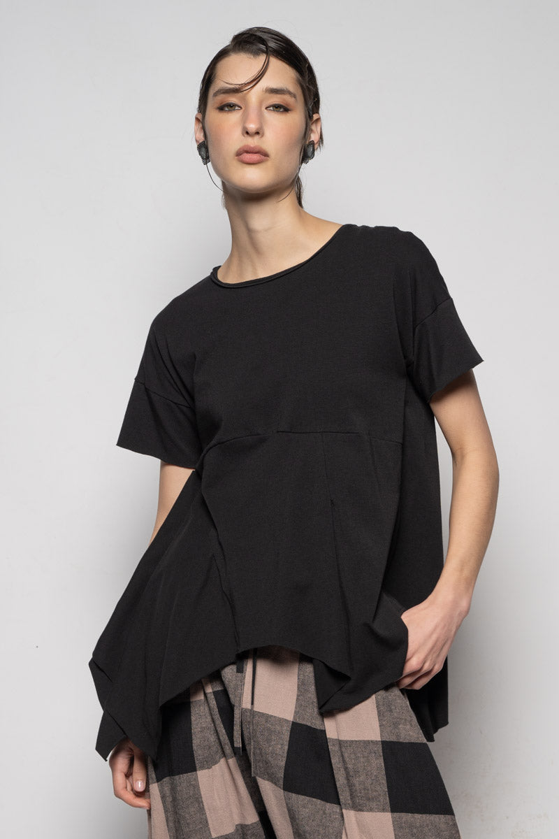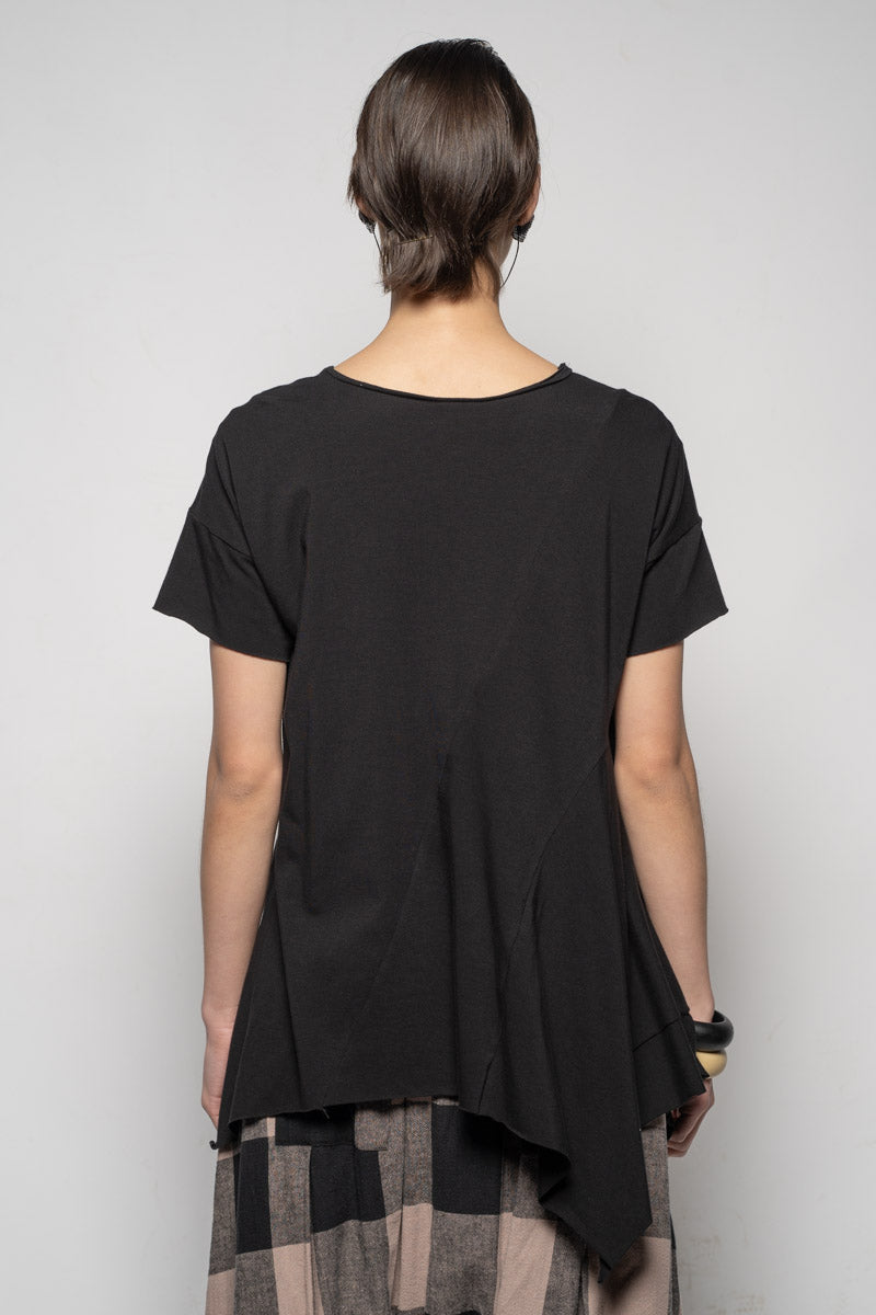 A refined take on the classic tee, the Banka Top distills everyday ease into a clean, architectural form. Cut from breathable cotton with a hint of spandex, it falls into an effortless drape, defined by its asymmetrical hem and subtle panel details.
