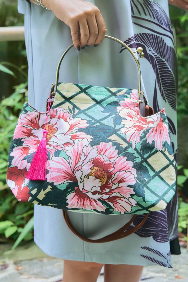 A statement of quiet elegance, the Botan pairs a vintage metal frame with a vivid Japanese cotton peony print. Carry it by the sculptural brass handle for an evening glow, or clip on the adjustable shoulder strap for easy days about town. A bright tassel adds a joyful accent; the roomy, softly–structured body holds phone, wallet, small diary and more, with an inner slip pocket to keep essentials close. Gift-ready and beautifully made—practical poetry for every outing.