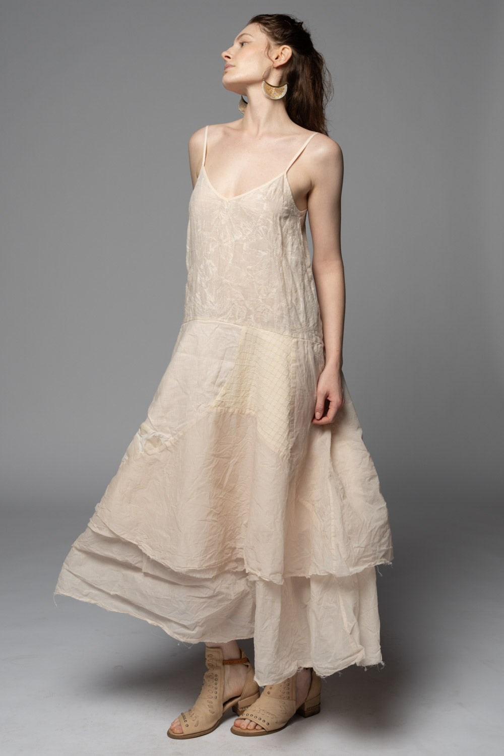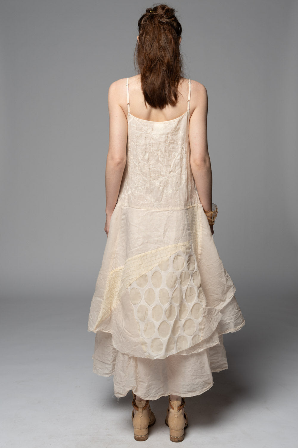 A light–catching dress with a sense of wander and salt-air ease. Celia drifts around the body in soft layers and pieced panels, creating movement that feels playful and romantic. The airy mix of natural fabrics gives subtle texture and depth, while the twirl-worthy hem brings a little summer theatre to everyday life. Wear it simply with bare shoulders, or layer under the Celia Wrap and let the silhouette float.