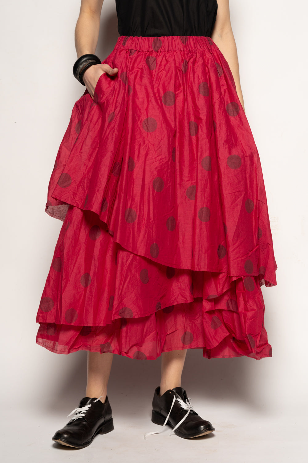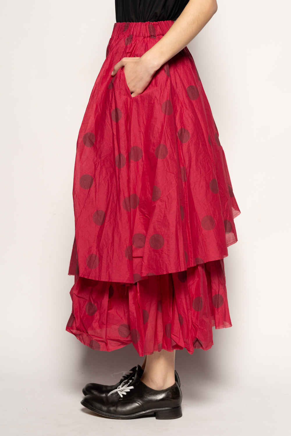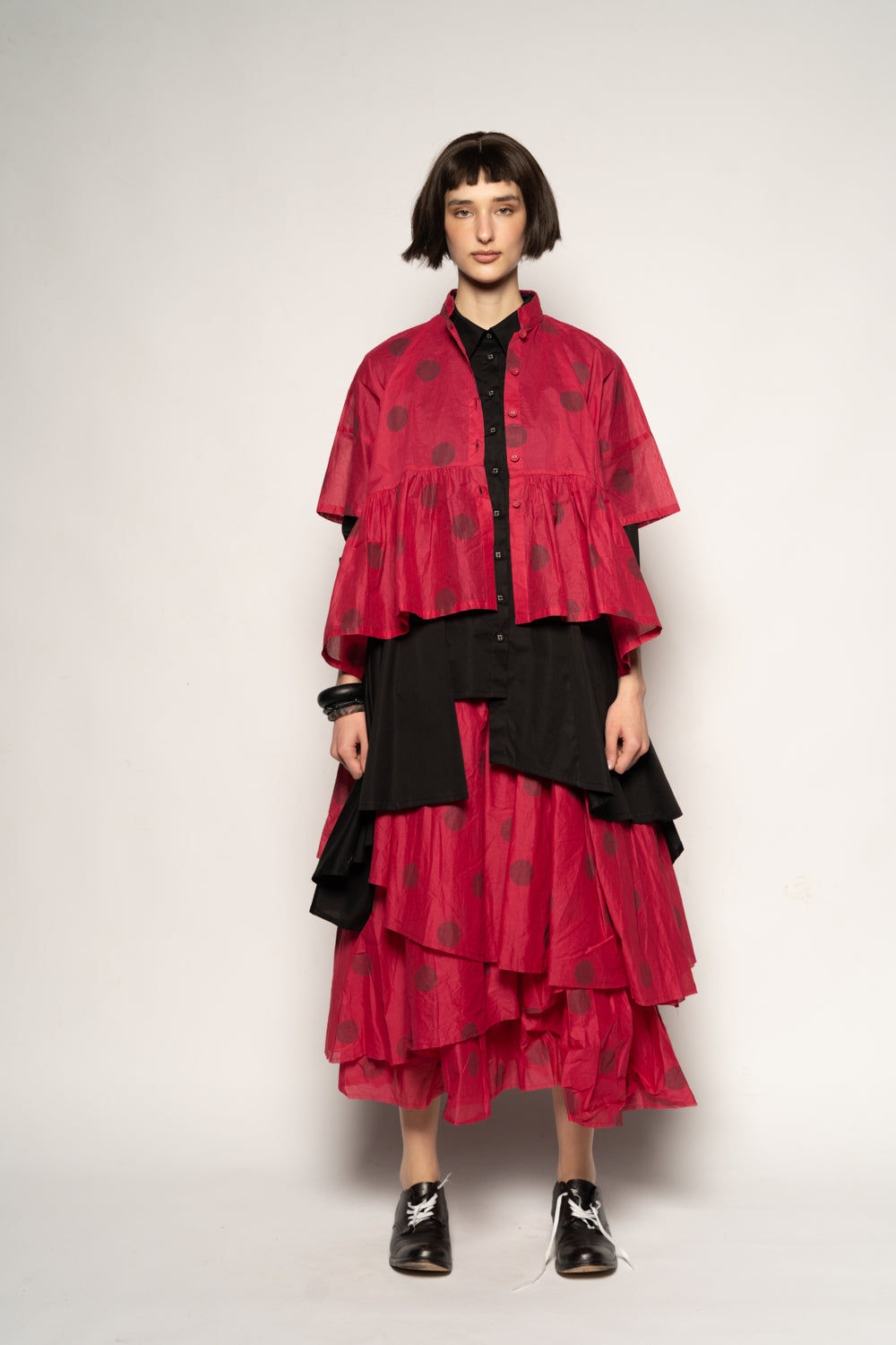 The Dotto Layer Skirt moves with a soft, romantic sway—light as breath, quietly dramatic. Sheer cotton organdy drapes in asymmetric tiers that float around the body, while a voile lining keeps it gentle against the skin. A comfortable elastic waist and hidden pockets make it as easy to wear as it is beautiful. Crush the fabric softly in your hands to create a delicate, lived-in texture—perfect for travel and trans-seasonal layering.