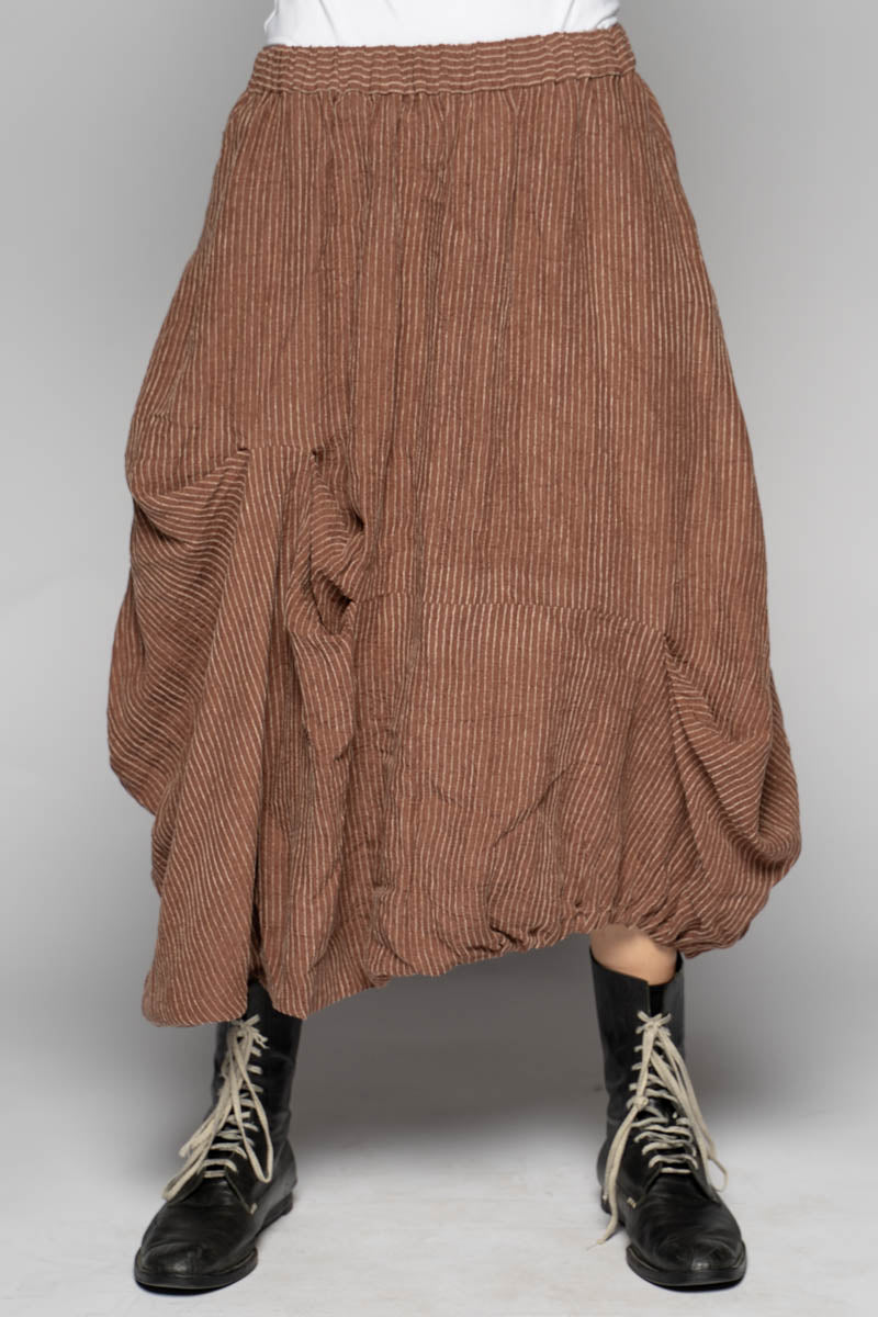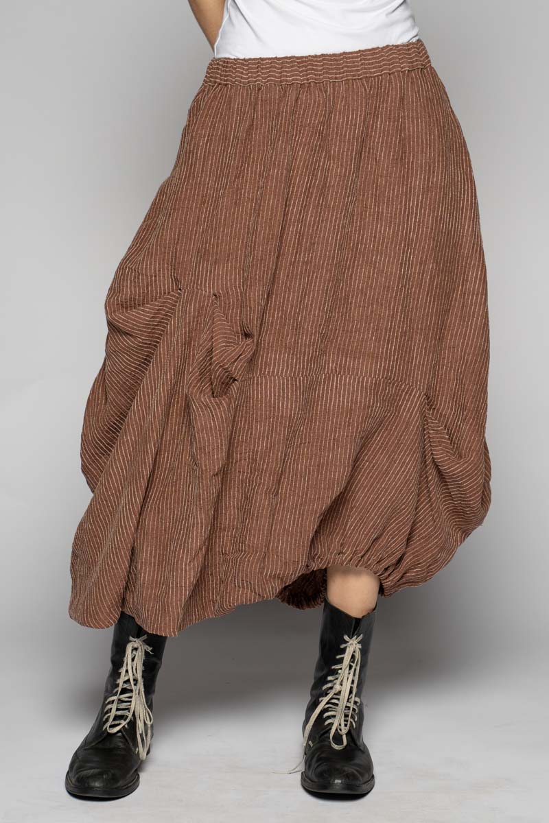 The Ember Skirt forms its shape through movement — folds that gather, release, and shift as the body walks. Cut in a textured linen–rayon pinstripe, the fabric carries both softness and quiet structure, allowing the silhouette to swell and collapse in unexpected ways.