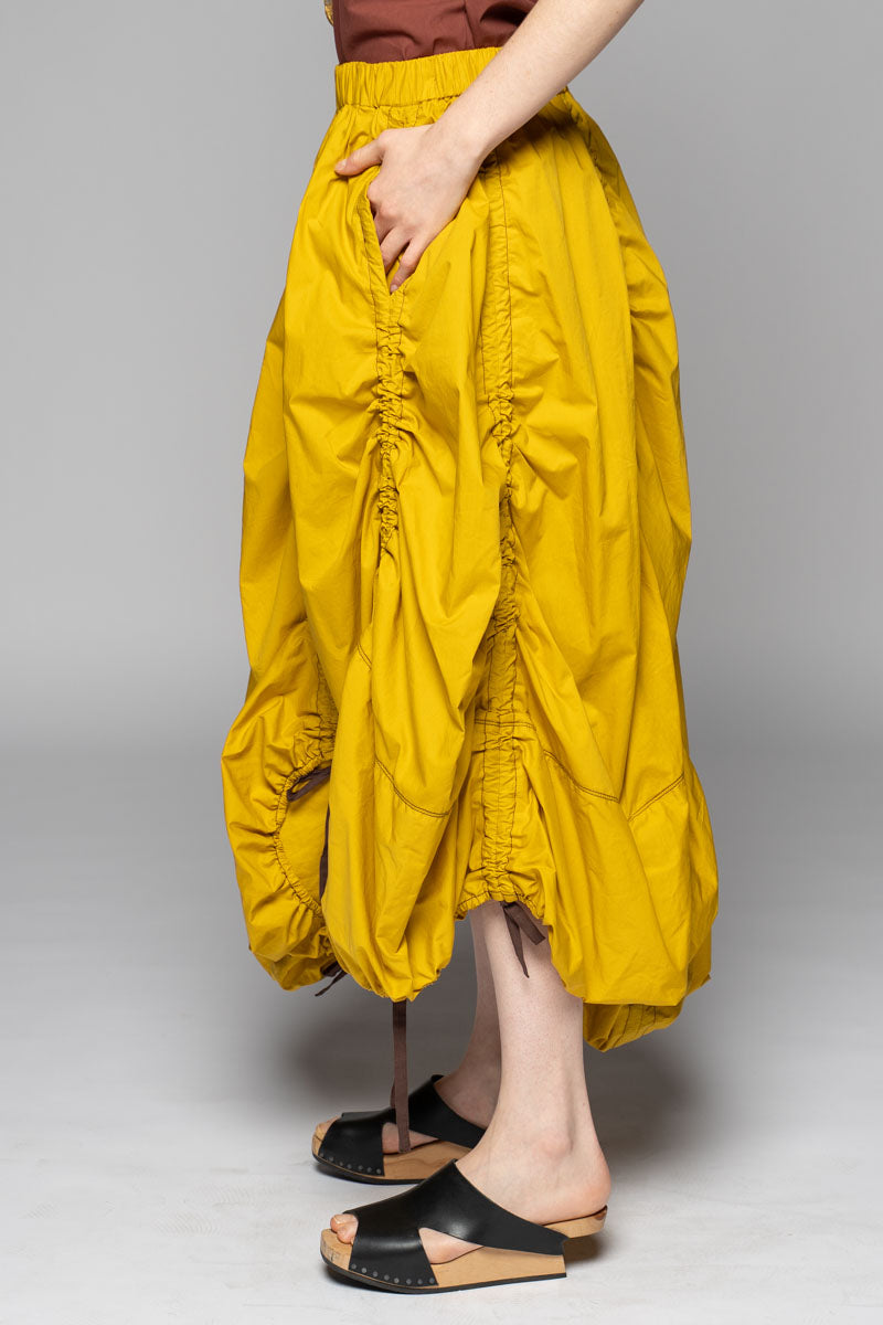 Crisp cotton poplin is shaped into soft architecture: the Faerwin Skirt drapes light as air, then sculpts with adjustable ruching ties to create buoyant volume and a beautifully irregular hem. A wide, full elastic waistband sits comfortably through the day, while deep pockets and contrast stitching lend utility and subtle detail. Pair with the Gisella Top or Gisella Tunic for an effortless set.
