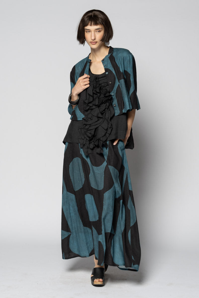 An art piece you can wear. The Kakure Short Jacket is cut in a comfortable linen–viscose blend and printed with Sally’s softly drawn “vessels”—organic forms that honour the quiet beauty of holding and sharing. Fresh and light for spring, Kakure brings gentle structure to soft layers. Wear it buttoned as a neat top or open as an easy jacket—the cropped proportion sits beautifully over dresses and high-waist pants.