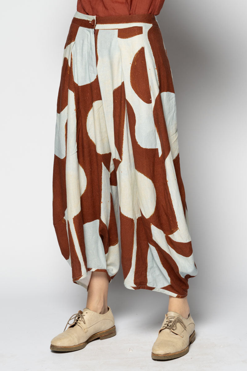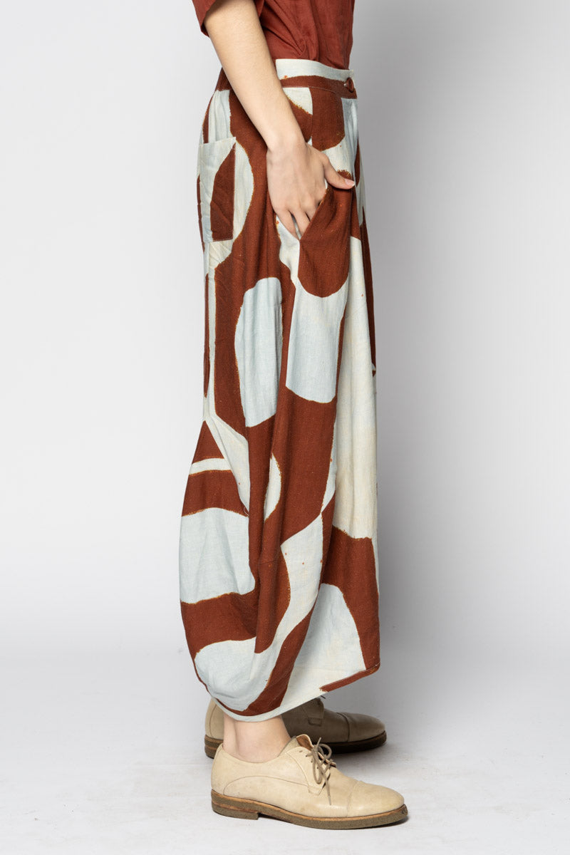 Artful ease with a sculptor’s hand. The Kakure Tie Pants are cut in a breathable linen–viscose blend printed with Sally’s vessel motifs—organic shapes that move softly as you do. A smooth waistband and deep front pleats create gentle volume through the leg, tapering toward the ankle for a flattering line. Hidden hem ties let you play with proportion: wear loose and airy, or cinch for a cocooned, sculptural silhouette. Dress them up with a neat jacket or keep them easy with a simple tee.