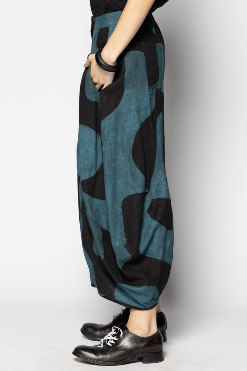 Artful ease with a sculptor’s hand. The Kakure Tie Pants are cut in a breathable linen–viscose blend printed with Sally’s vessel motifs—organic shapes that move softly as you do. A smooth waistband and deep front pleats create gentle volume through the leg, tapering toward the ankle for a flattering line. Hidden hem ties let you play with proportion: wear loose and airy, or cinch for a cocooned, sculptural silhouette. Dress them up with a neat jacket or keep them easy with a simple tee.