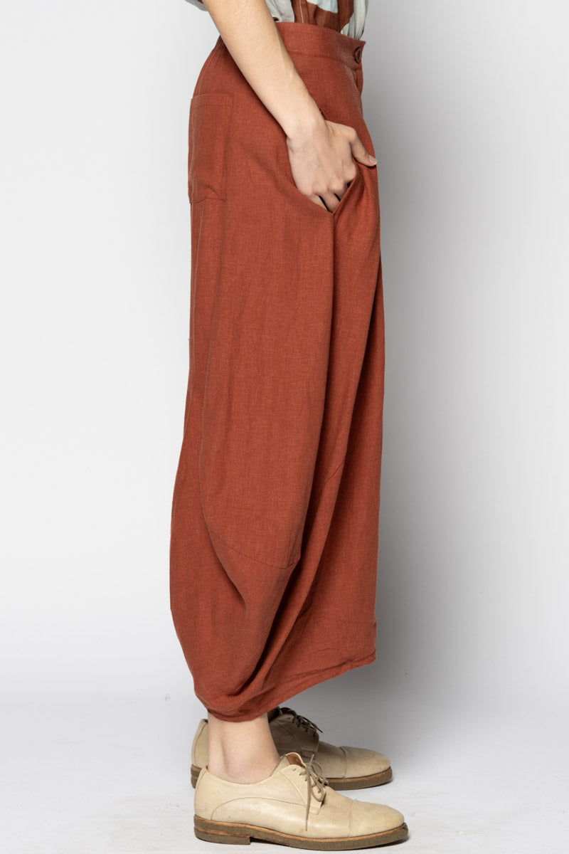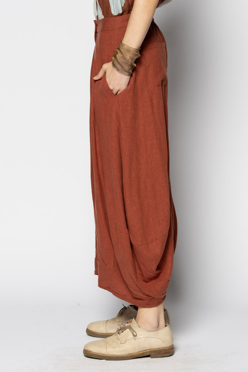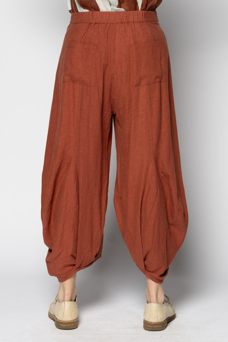 Sculpted ease in everyday cloth. The Kaya Tie Pants are cut in a breathable linen–viscose blend that drapes softly yet holds shape. A smooth waistband and deep front pleats create gentle volume through the leg, tapering toward the ankle for a flattering line. Hidden hem ties let you play with proportion—wear loose and airy, or cinch for a cocooned, sculptural silhouette. Dress them up with a neat jacket or keep them easy with a simple tee.