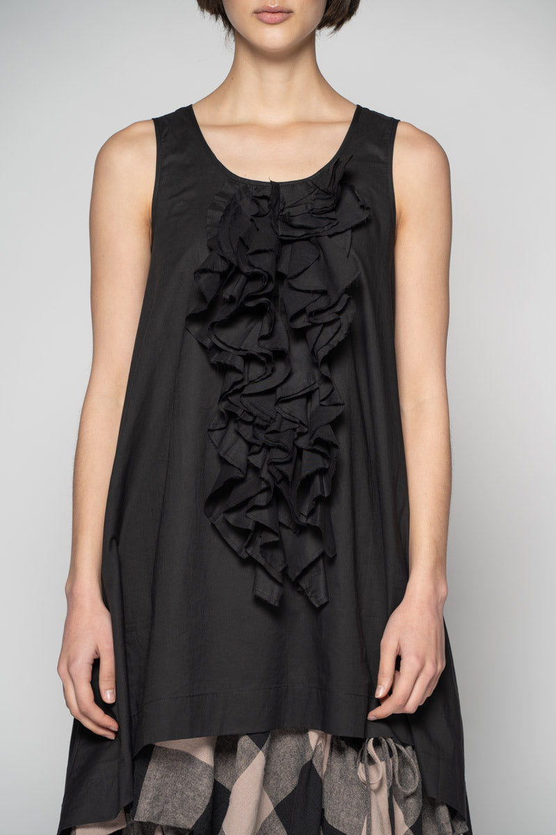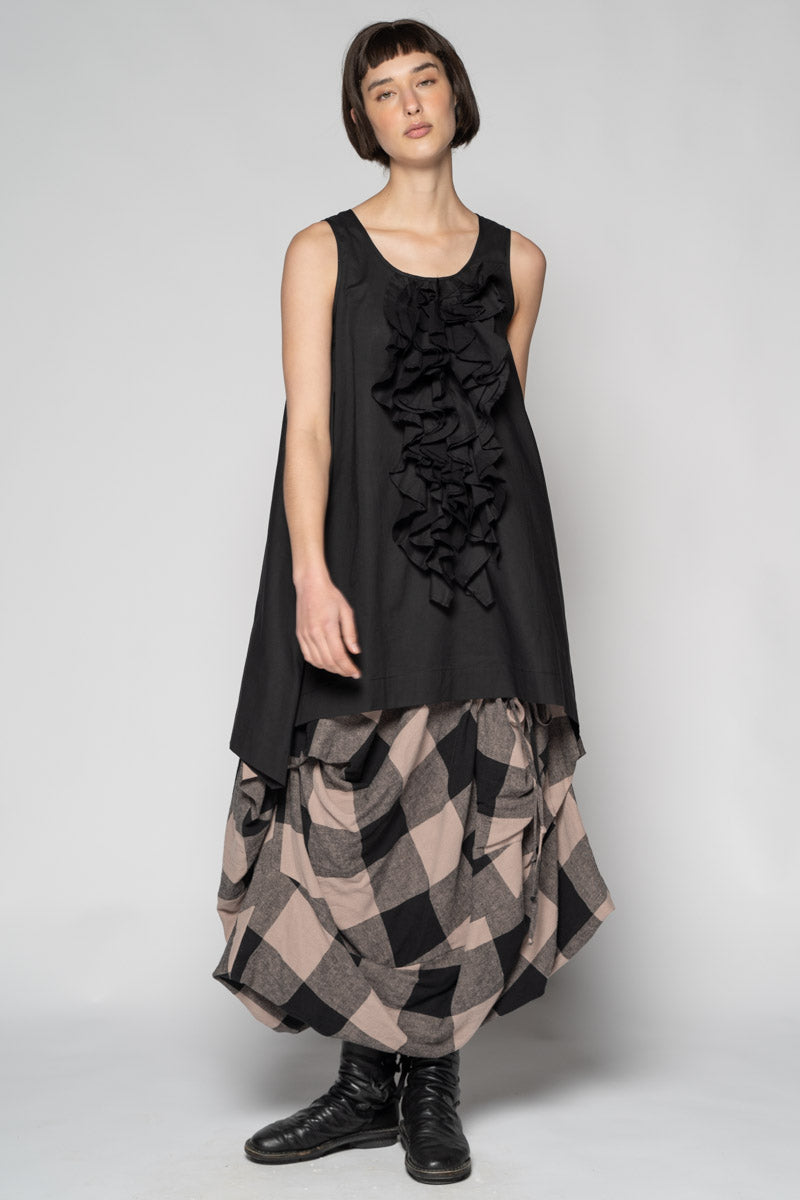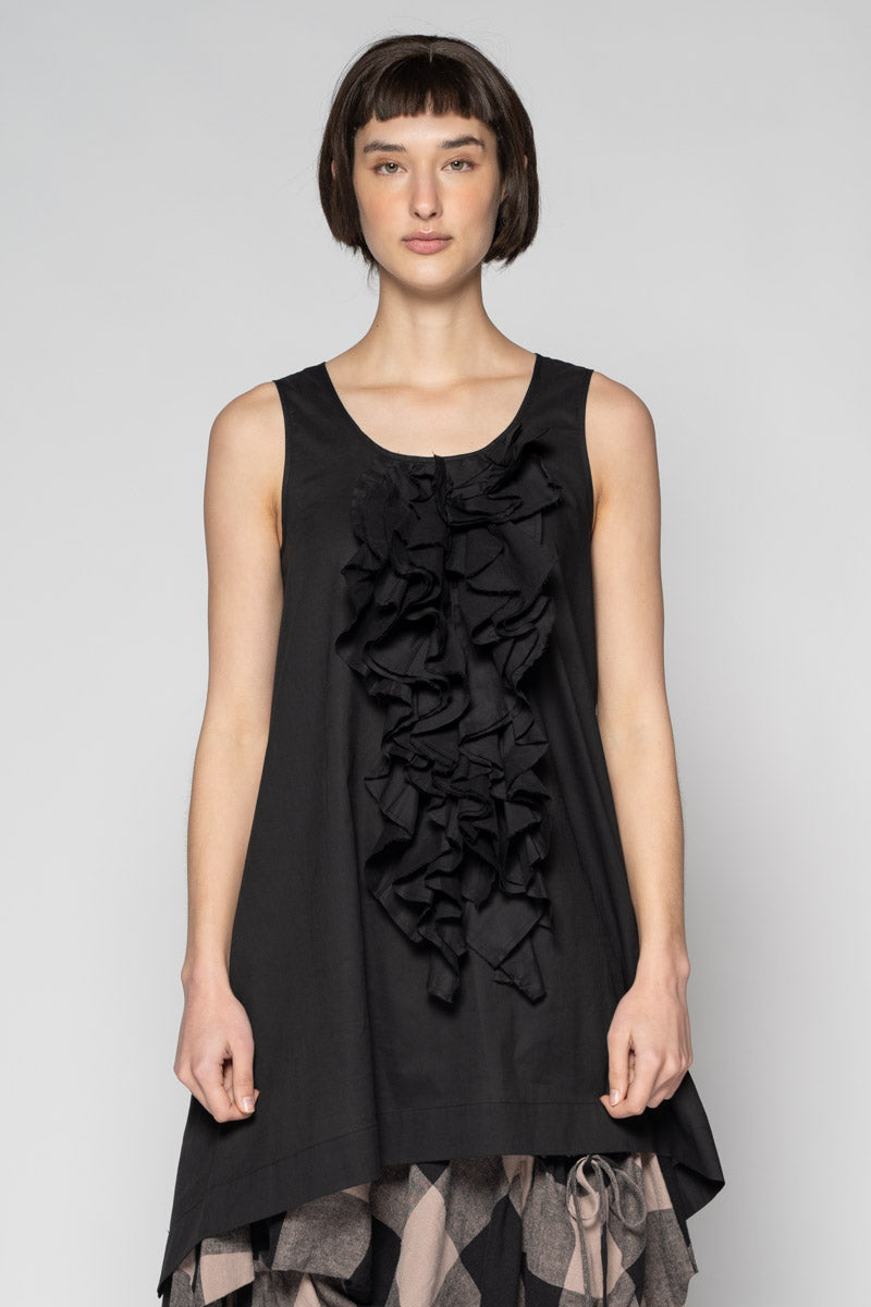 With a silhouette that floats just beyond the hem, the Kiki Frill Tunic brings a sense of soft structure and romantic ease. Inspired by antique frill collars and softened Edwardian layers, it features a cascade of raw-edged ruffles falling gently across the front — a quiet nod to historical dress, reimagined in breathable cotton voile.