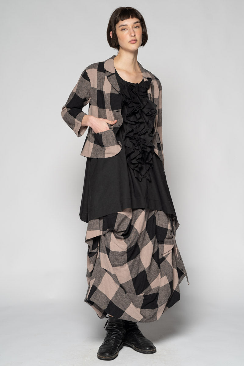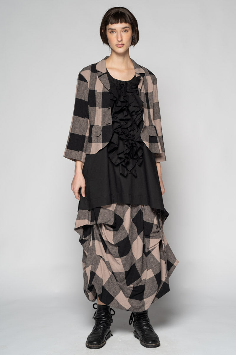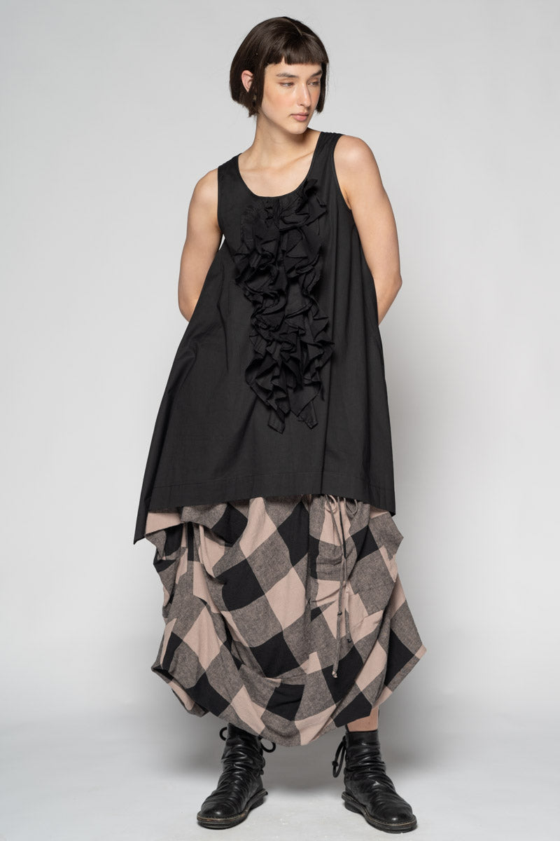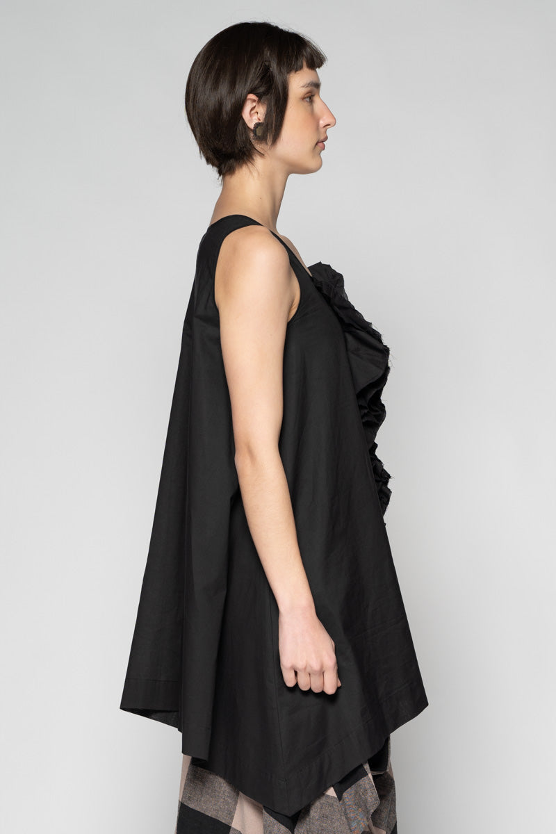 With a silhouette that floats just beyond the hem, the Kiki Frill Tunic brings a sense of soft structure and romantic ease. Inspired by antique frill collars and softened Edwardian layers, it features a cascade of raw-edged ruffles falling gently across the front — a quiet nod to historical dress, reimagined in breathable cotton voile.