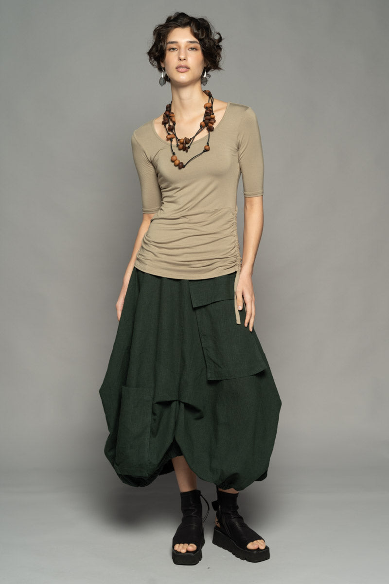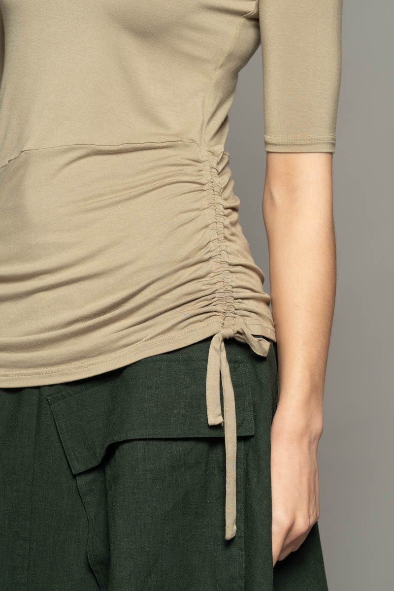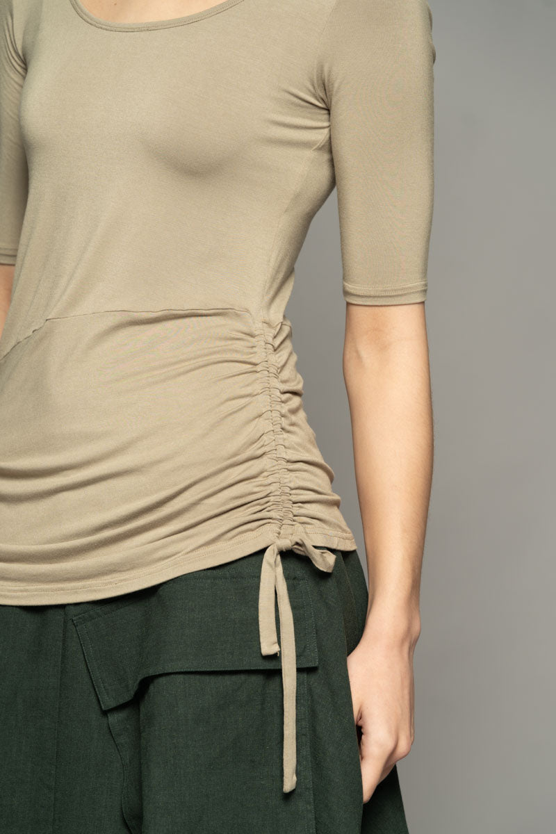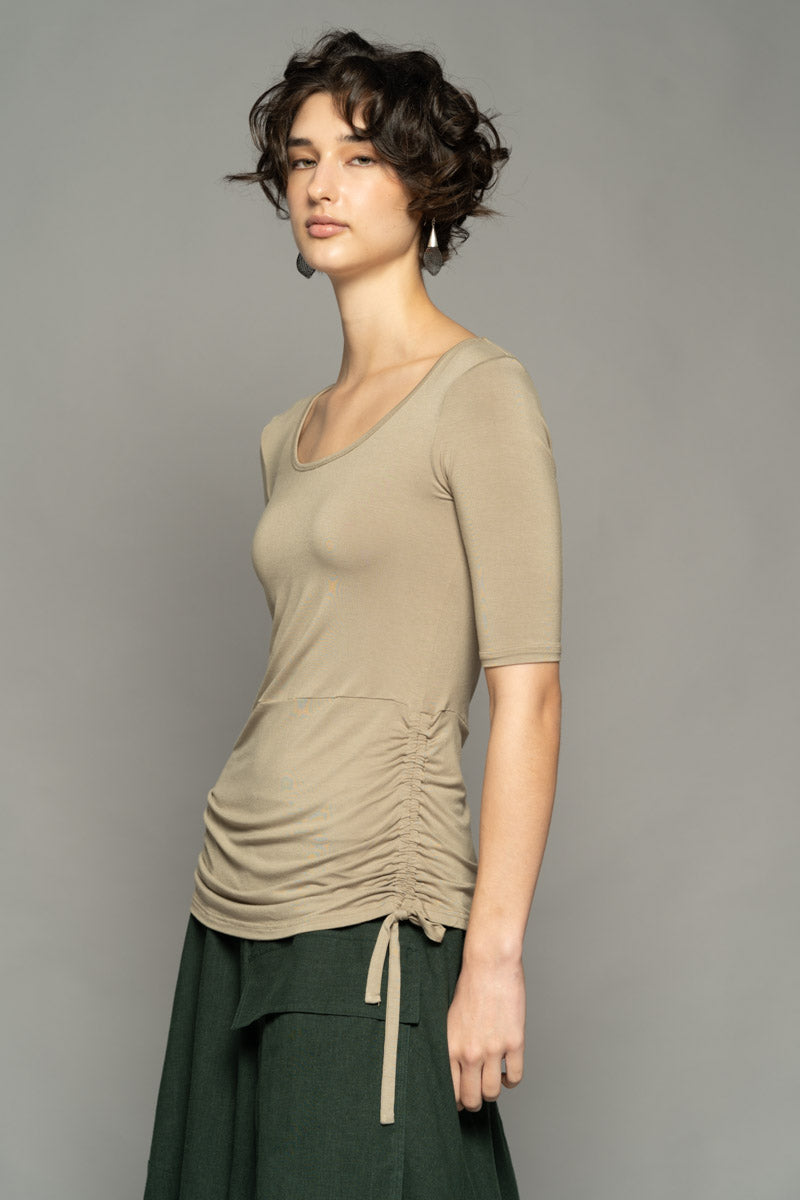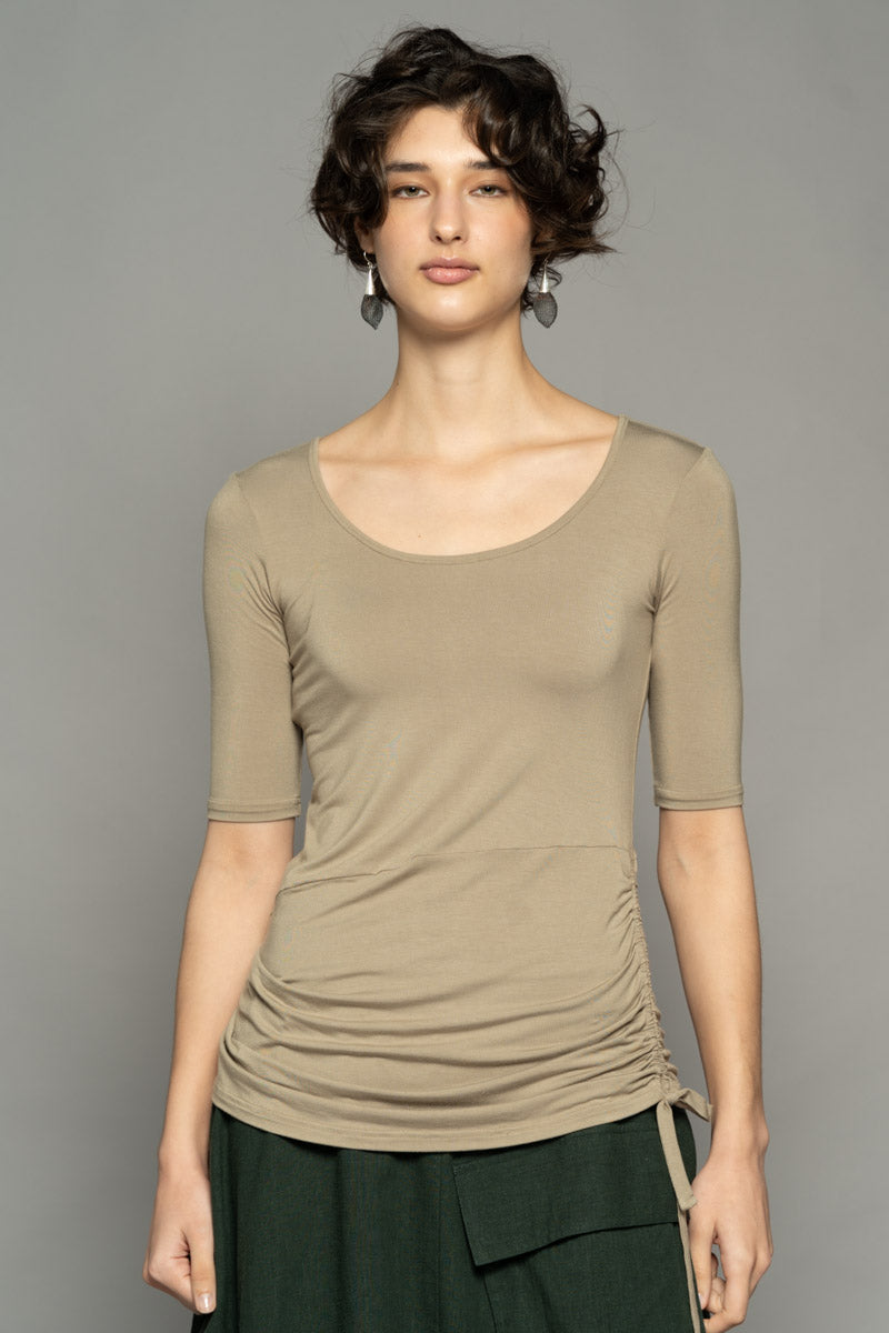 Simple never felt so good! The beautiful bamboo blend of our Kuro Gather Top is creamy-soft and breathable. This elegant basic is designed to take you through the seasons, for work or for play. The half-length sleeves are perfect for air-conditioning, evenings, or for our ladies who like a little more cover on the arm. We've added a drawstring on one side-seam so the length and asymmetry can be adjusted to suit, as well as providing flattering diagonal lines across the stomach. The comfortable coordinate for any pant or skirt, you'll want one of each colour!