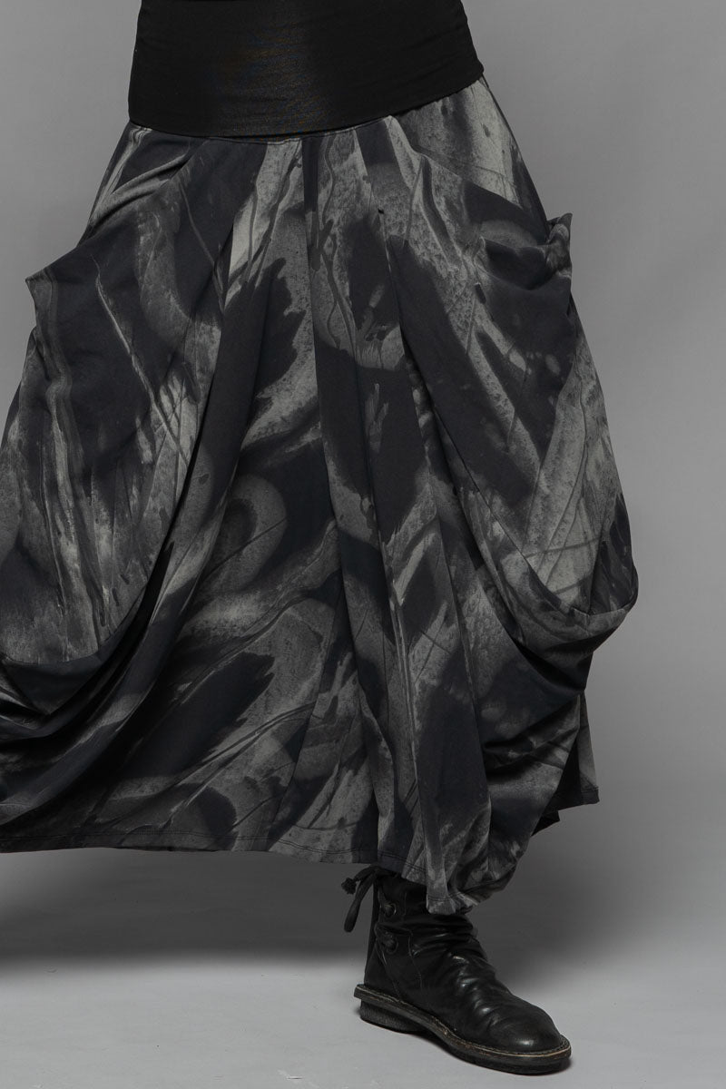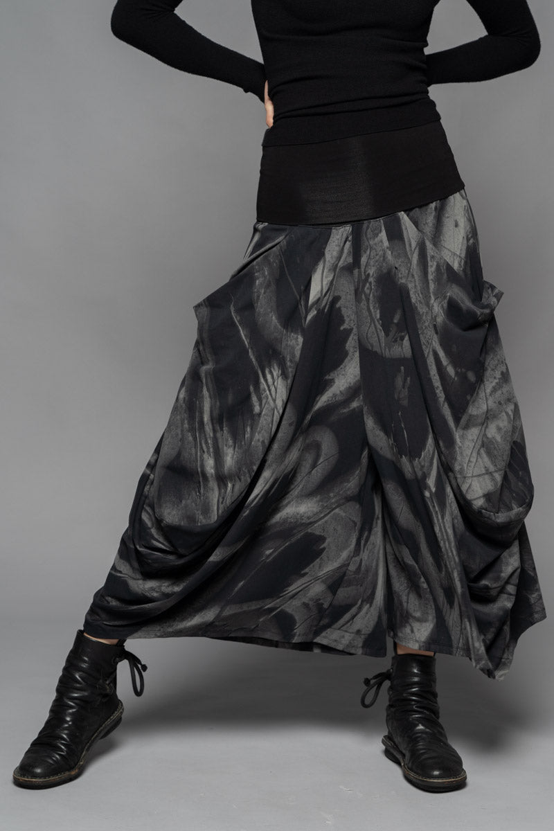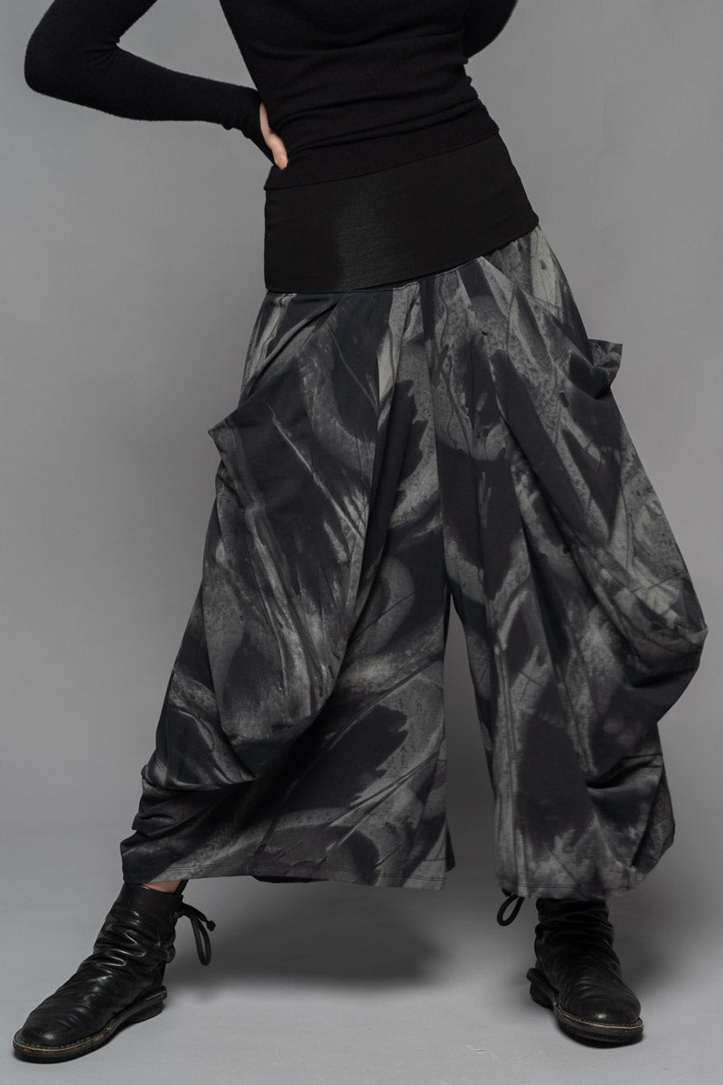 With a moody elegance, the Meimu Pants evoke quiet drama through sculptural draping and bold, voluminous form. Crafted from a lightweight cotton spandex in the Shadow print, they offer a fluid, flexible fit that moves with you. Featuring a soft, structured waistband, generous pockets, and a wide leg that tapers just at the ankle—an understated silhouette with depth and presence. Pair with the Kuki Tunic and Fude Patch Top for a layered winter ensemble that feels both enigmatic and refined.