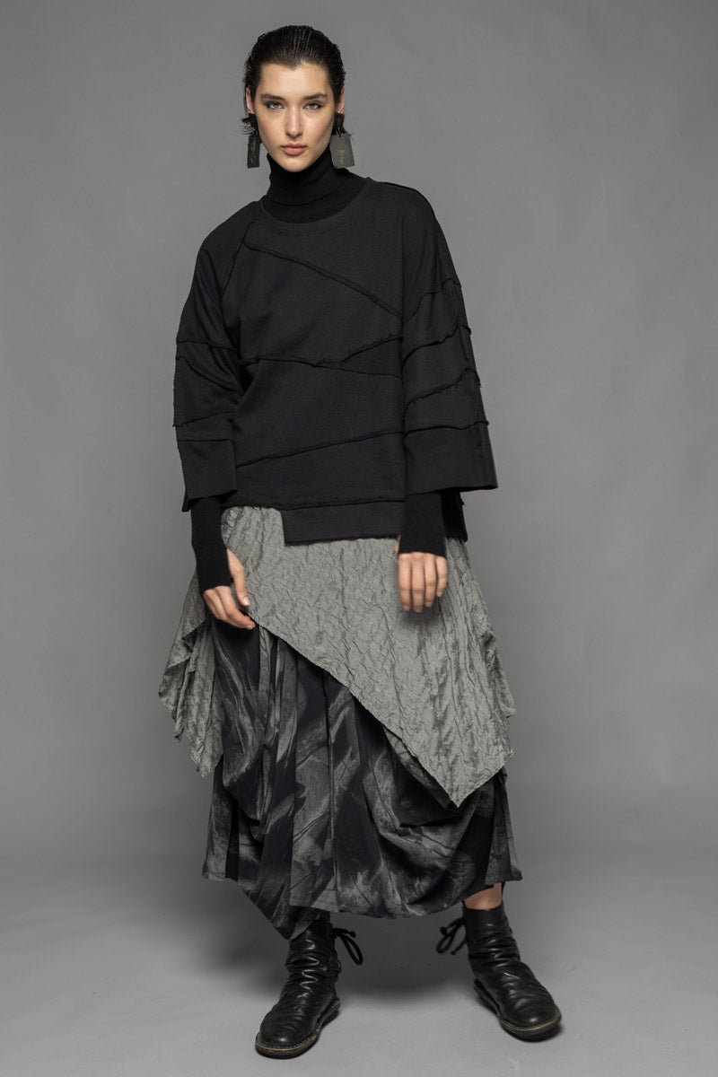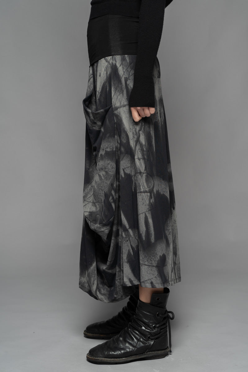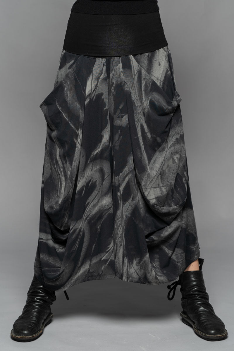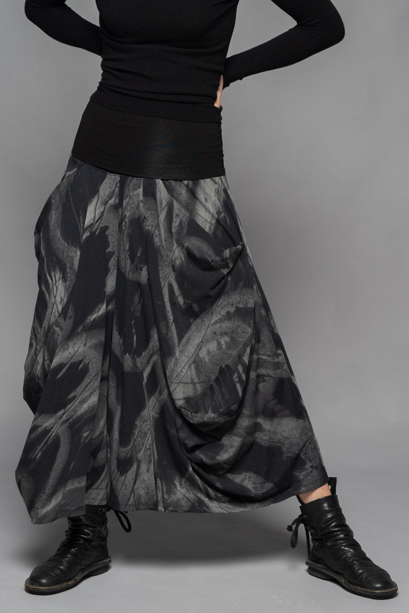 With a moody elegance, the Meimu Pants evoke quiet drama through sculptural draping and bold, voluminous form. Crafted from a lightweight cotton spandex in the Shadow print, they offer a fluid, flexible fit that moves with you. Featuring a soft, structured waistband, generous pockets, and a wide leg that tapers just at the ankle—an understated silhouette with depth and presence. Pair with the Kuki Tunic and Fude Patch Top for a layered winter ensemble that feels both enigmatic and refined.