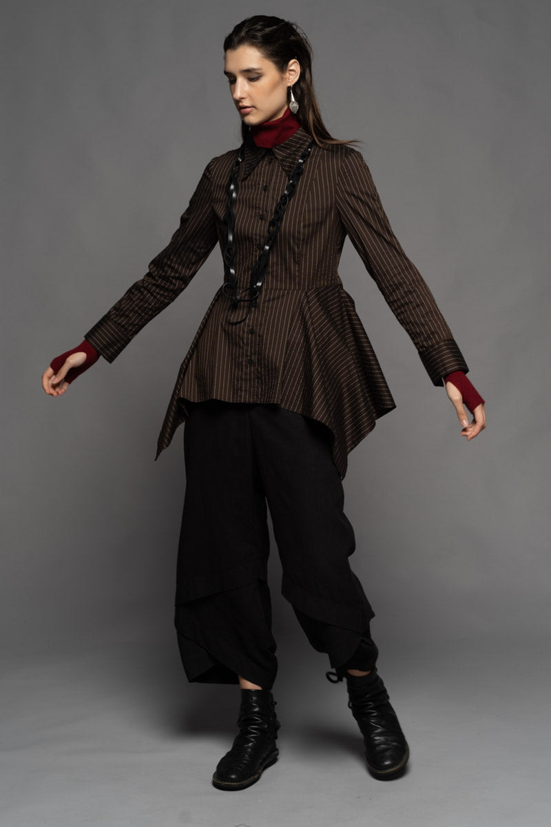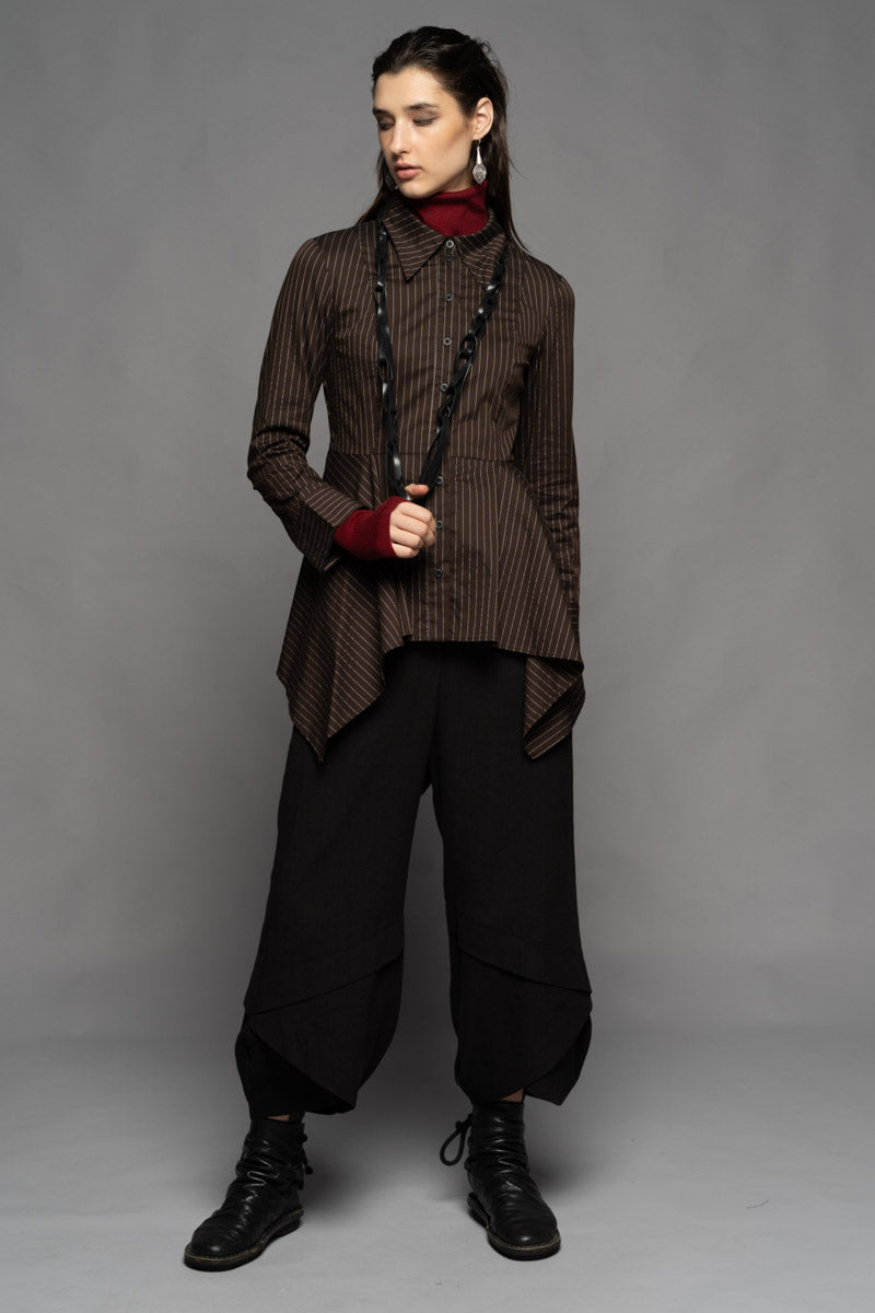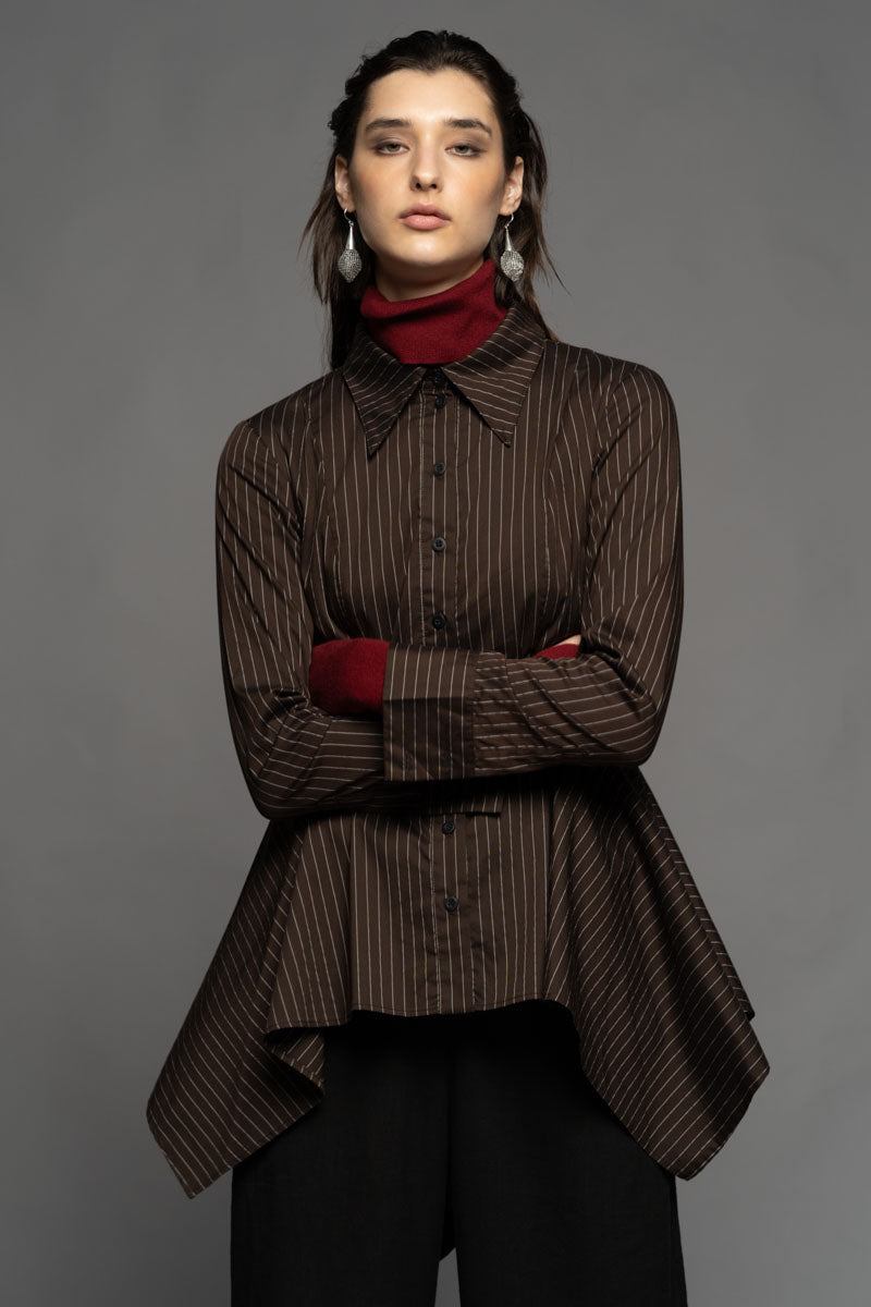 Once a symbol of power dressing and precision, pinstripes find new expression in the Najia Long Shirt. Merging tailored heritage with modern design, this piece is cut from soft pinstripe Cotton/Spandex and features a structured collar, fitted bust, and sculpted waistline. The cascading hem bring fluidity and contrast to its sharp upper form. Layer it over the Yoko High Neck Top and the Shuffle Pants to create a bold silhouette that moves with intention. Available in Black and Coffee.