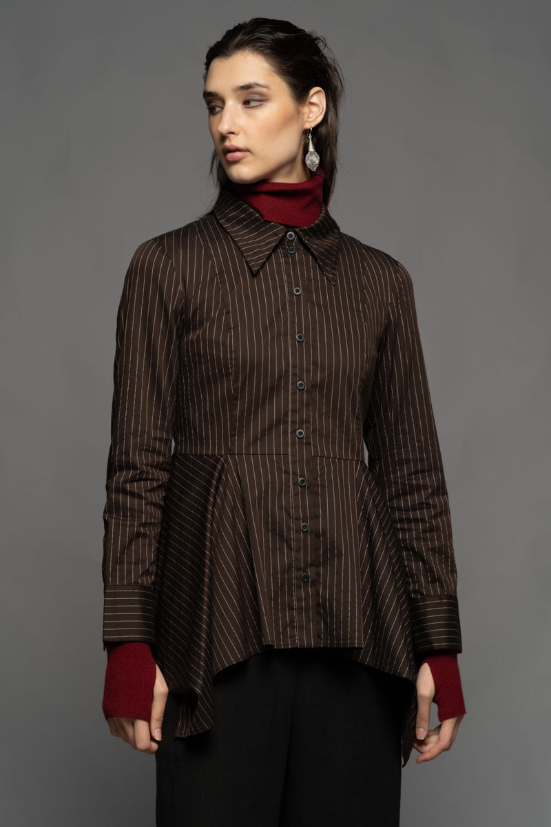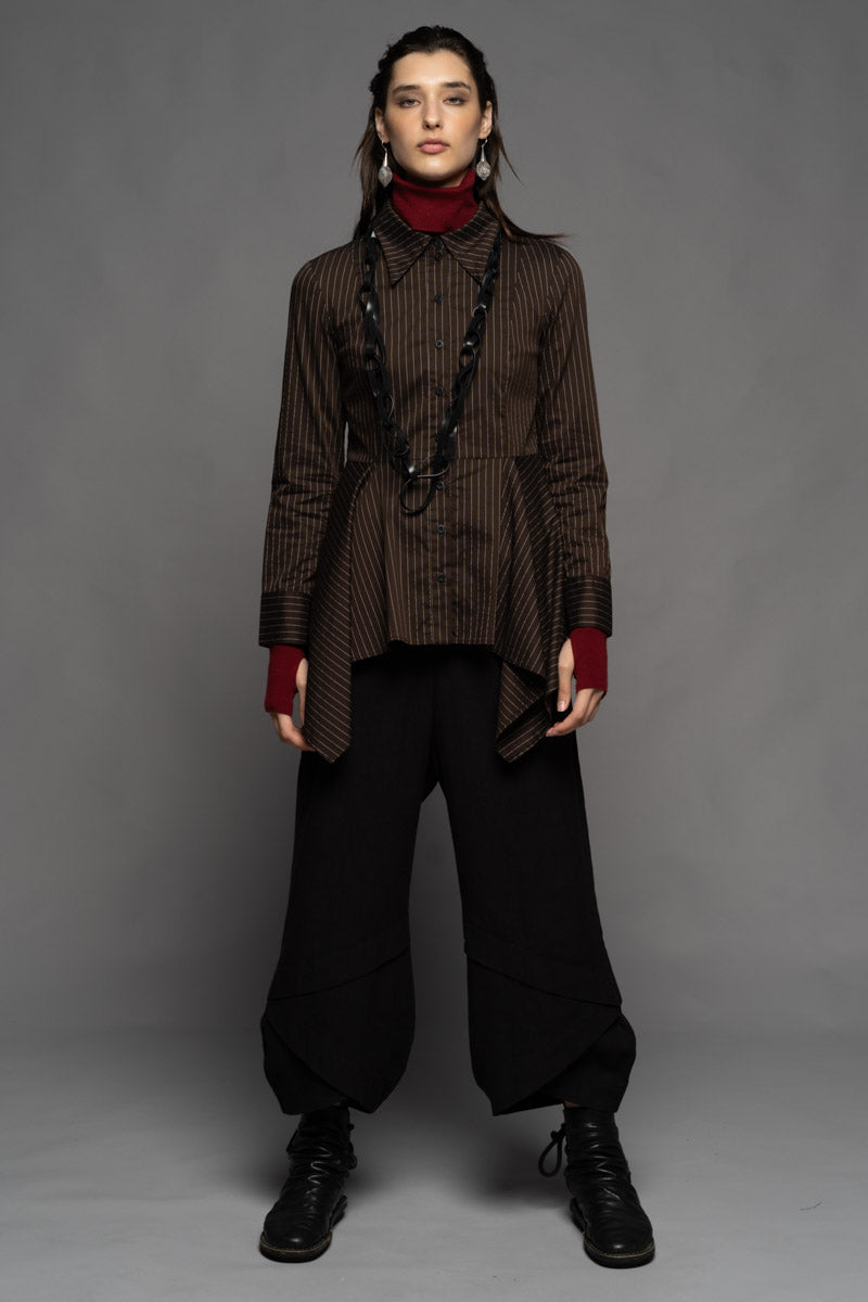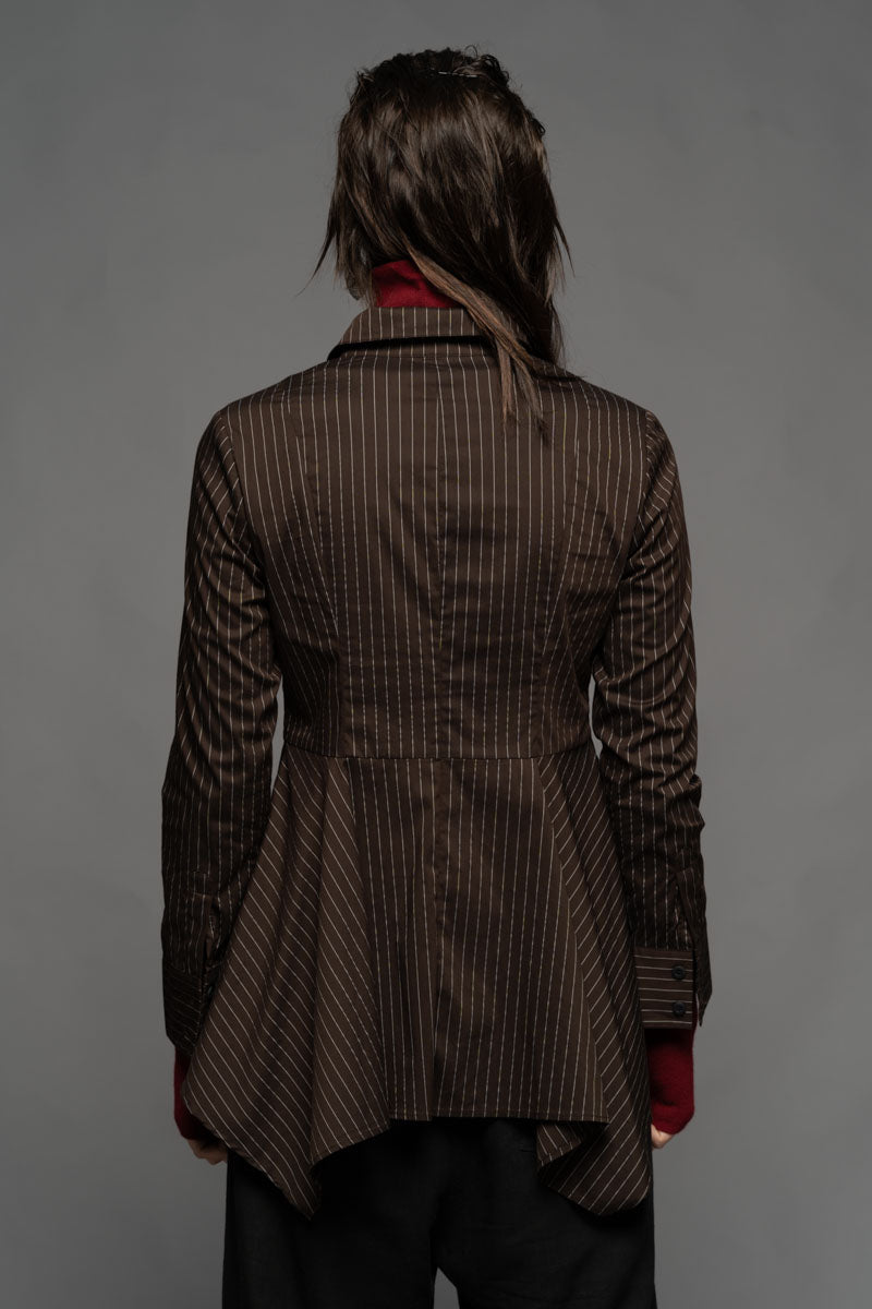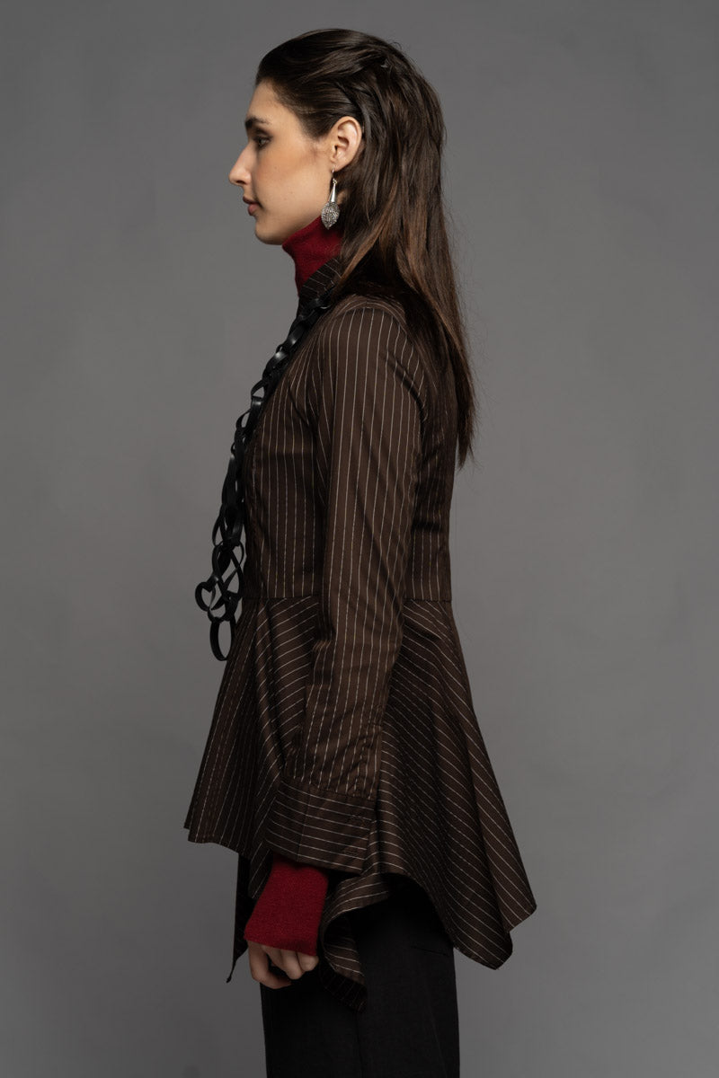 Once a symbol of power dressing and precision, pinstripes find new expression in the Najia Long Shirt. Merging tailored heritage with modern design, this piece is cut from soft pinstripe Cotton/Spandex and features a structured collar, fitted bust, and sculpted waistline. The cascading hem bring fluidity and contrast to its sharp upper form. Layer it over the Yoko High Neck Top and the Shuffle Pants to create a bold silhouette that moves with intention. Available in Black and Coffee.