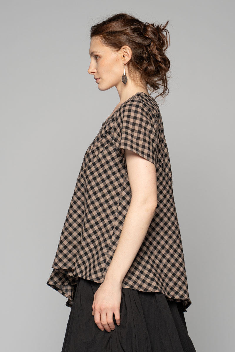 Quietly sculptural, the Nameko Drape Top brings an origami-like sweep to everyday dressing. A diagonal overlay creates a soft architectural line across the body, falling to a fluid, asymmetric hem with an easy swing. Short sleeves, a gentle scoop neckline and a breathable linen/cotton weave keep the silhouette effortless—beautiful pressed or worn with a softly crushed finish.