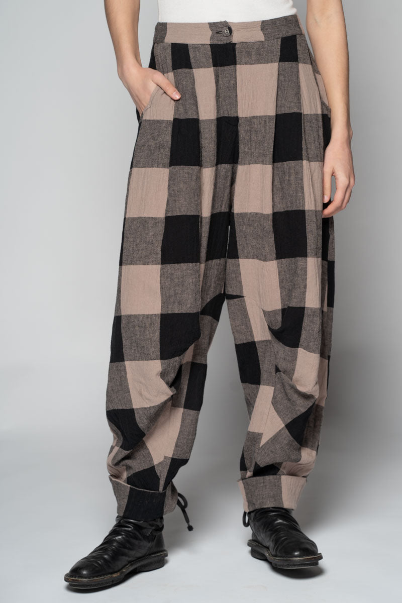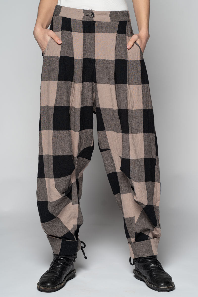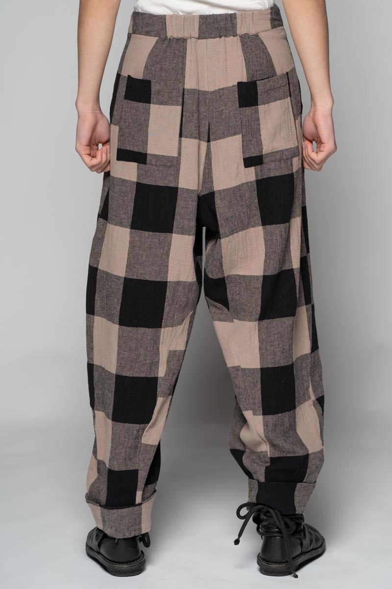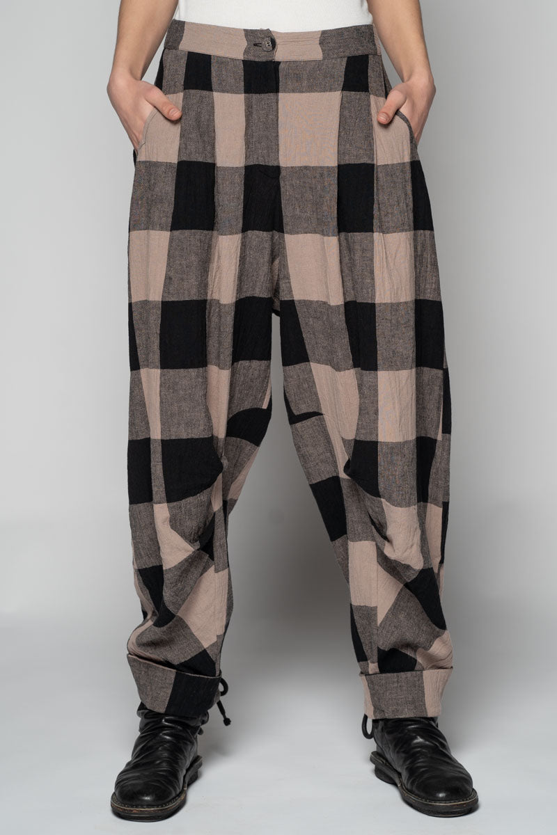 Softly structured and easy to live in, the Okina Pants bring a gentle spring volume to the wardrobe. Cut in our breathable linen/cotton blend, they sit comfortably at the waist, fall into relaxed pleats through the thigh, then taper neatly to the ankle. The check cloth has a quiet, time-worn feel—equally at home with a crisp shirt or the Kiki Frill Top on warmer days.