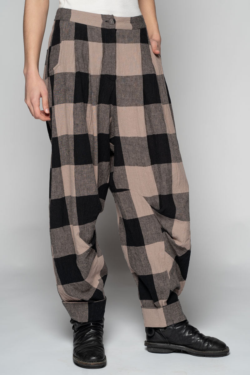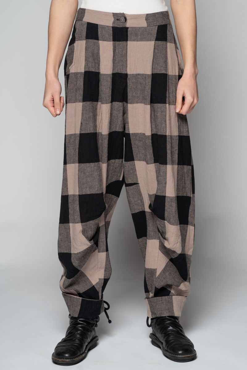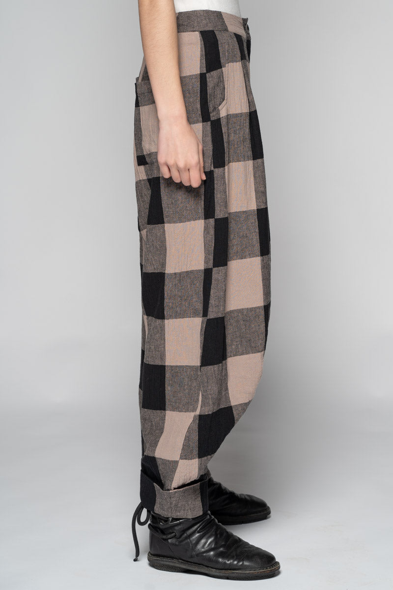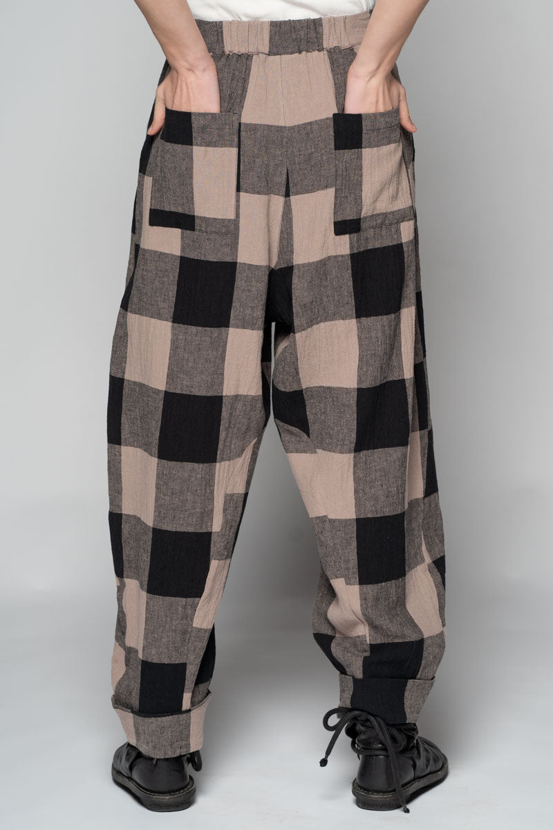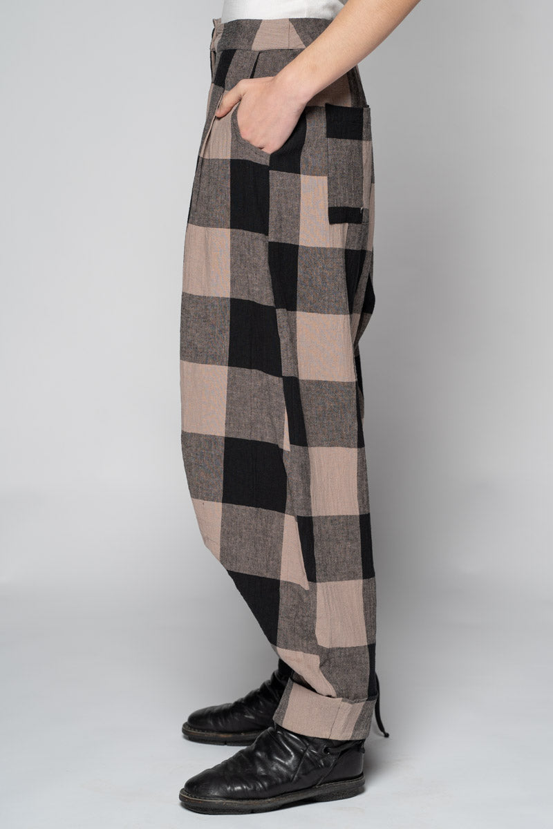 Softly structured and easy to live in, the Okina Pants bring a gentle spring volume to the wardrobe. Cut in our breathable linen/cotton blend, they sit comfortably at the waist, fall into relaxed pleats through the thigh, then taper neatly to the ankle. The check cloth has a quiet, time-worn feel—equally at home with a crisp shirt or the Kiki Frill Top on warmer days.
