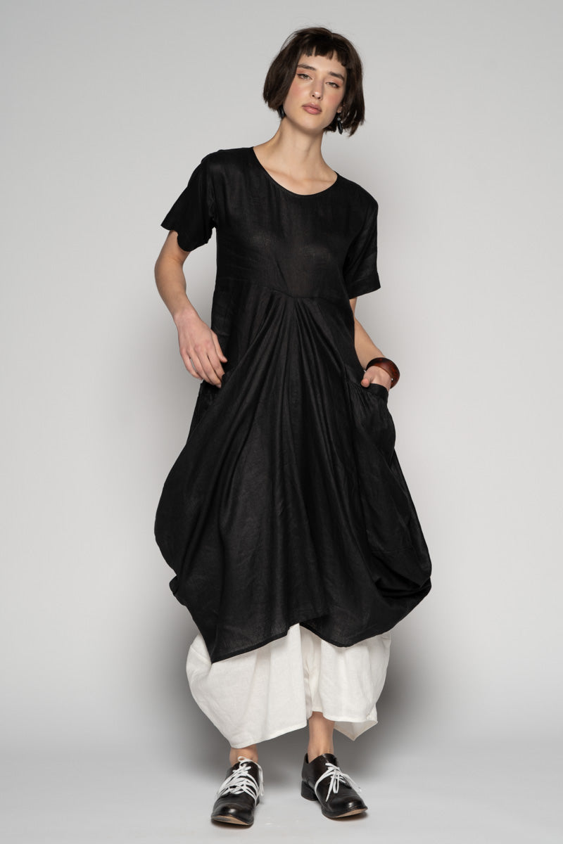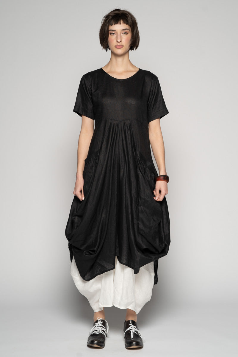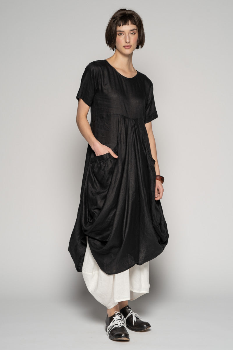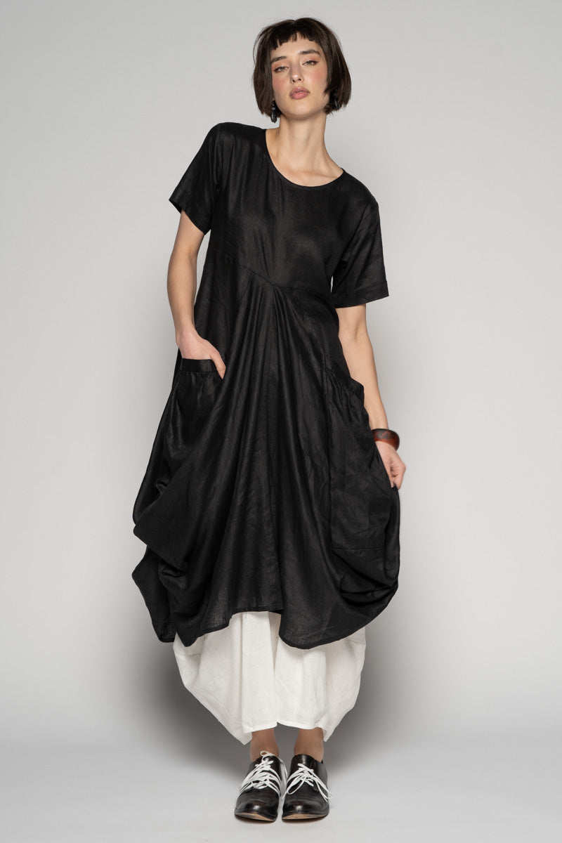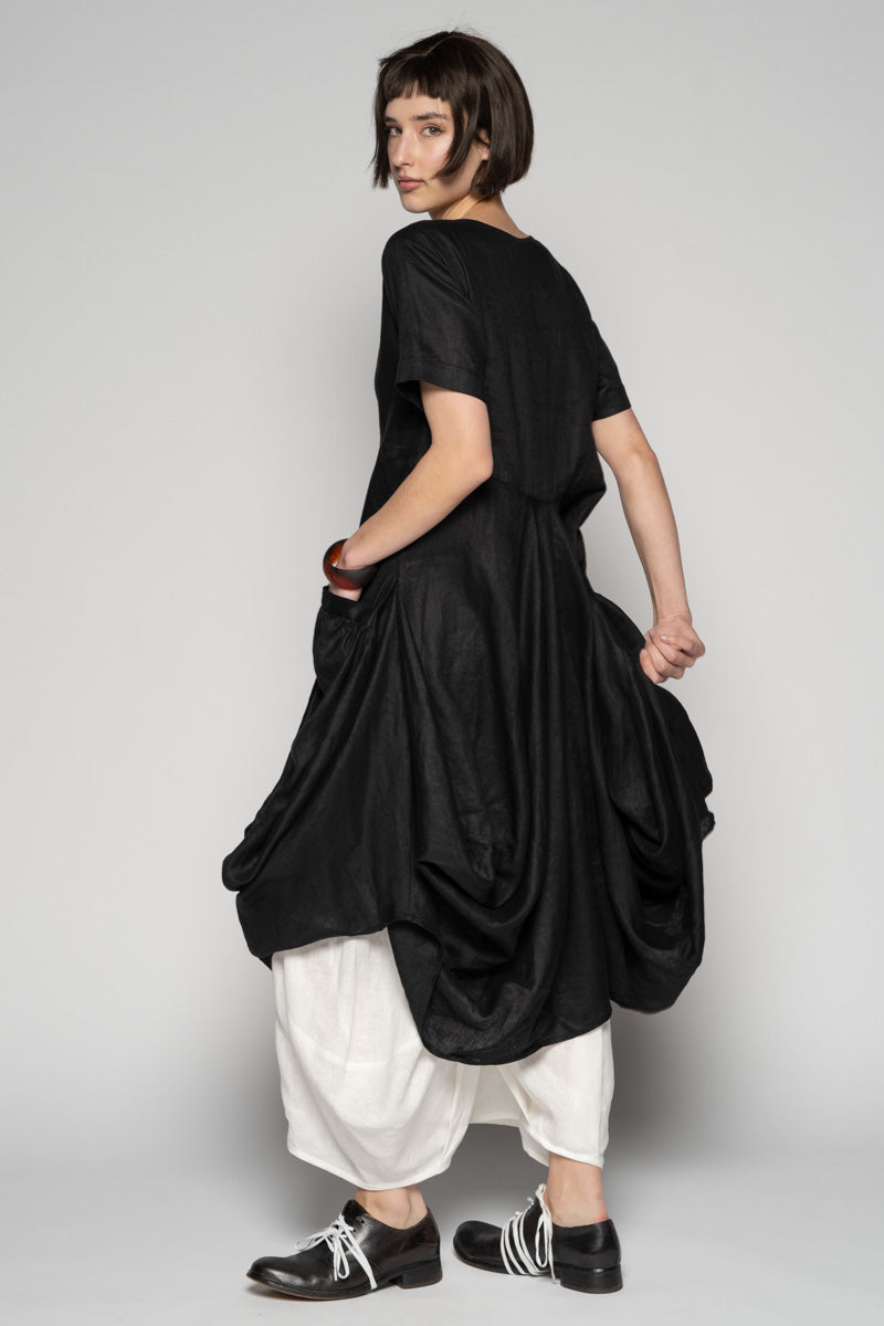 Softly structured and full of quiet movement, the Sabi Dress drifts between ease and sculpture. The soft linen fall into gentle folds, while draped pockets create a lived-in, artful volume.