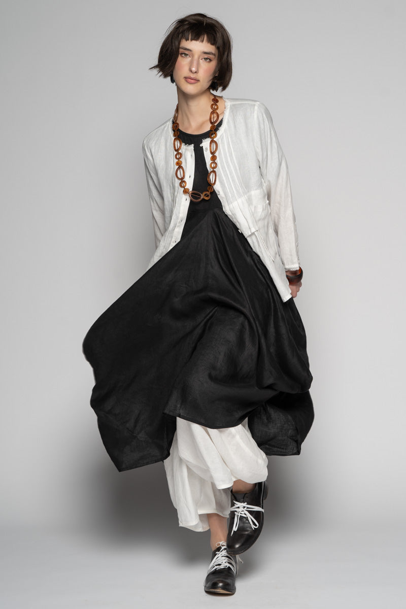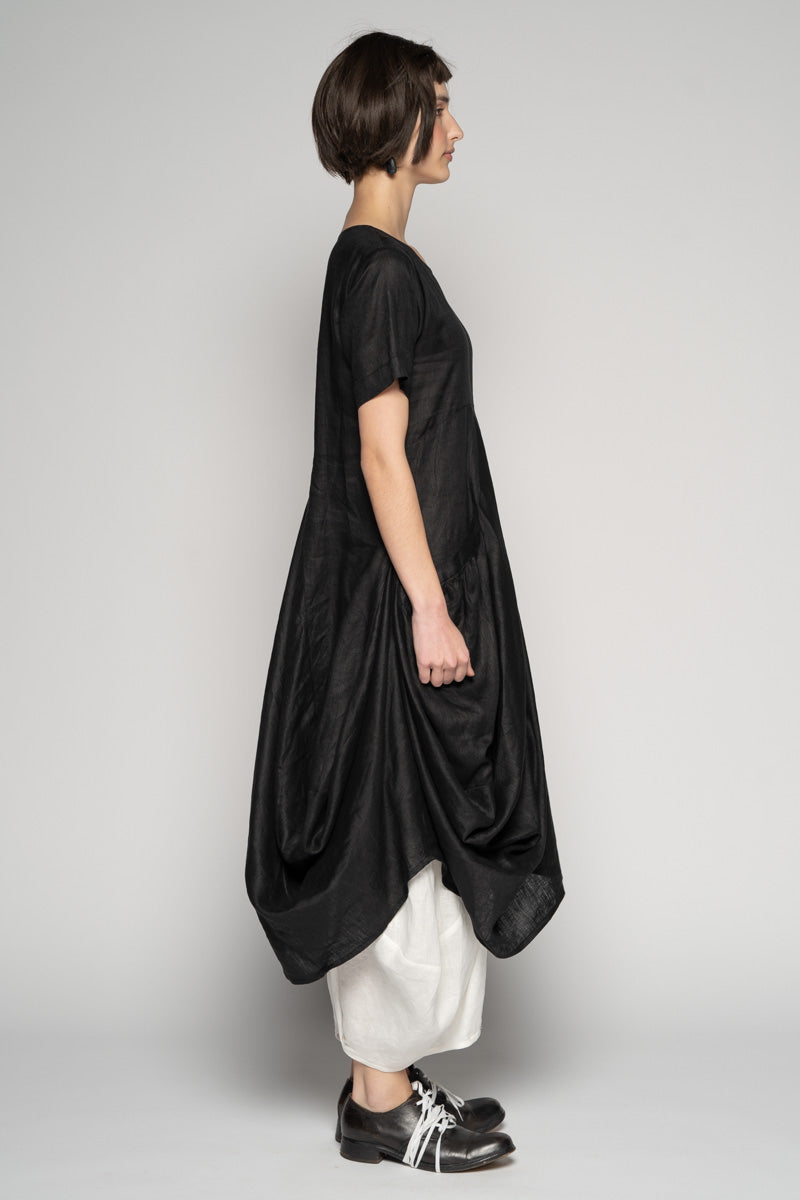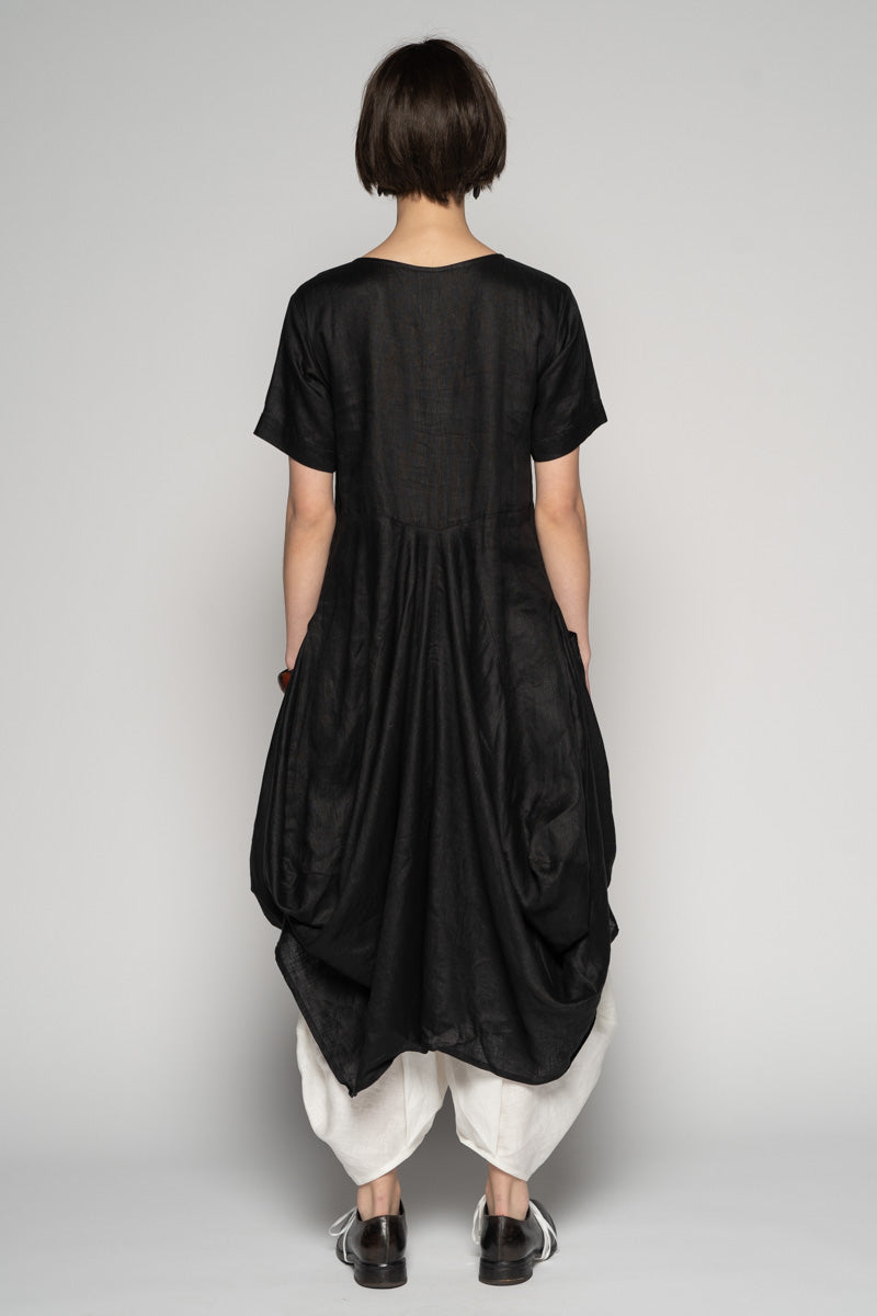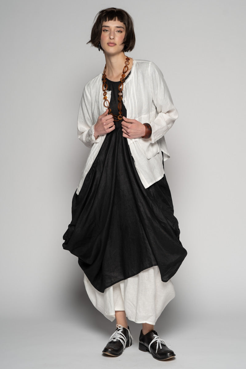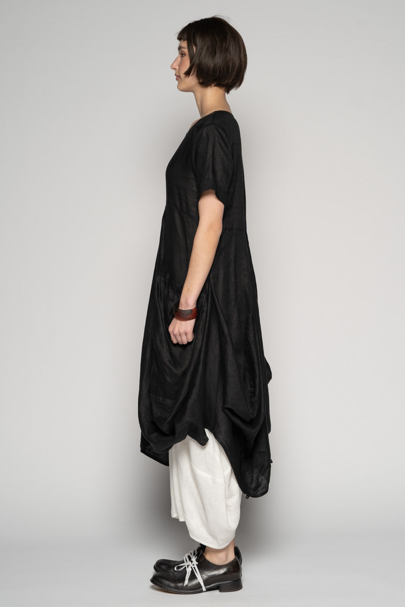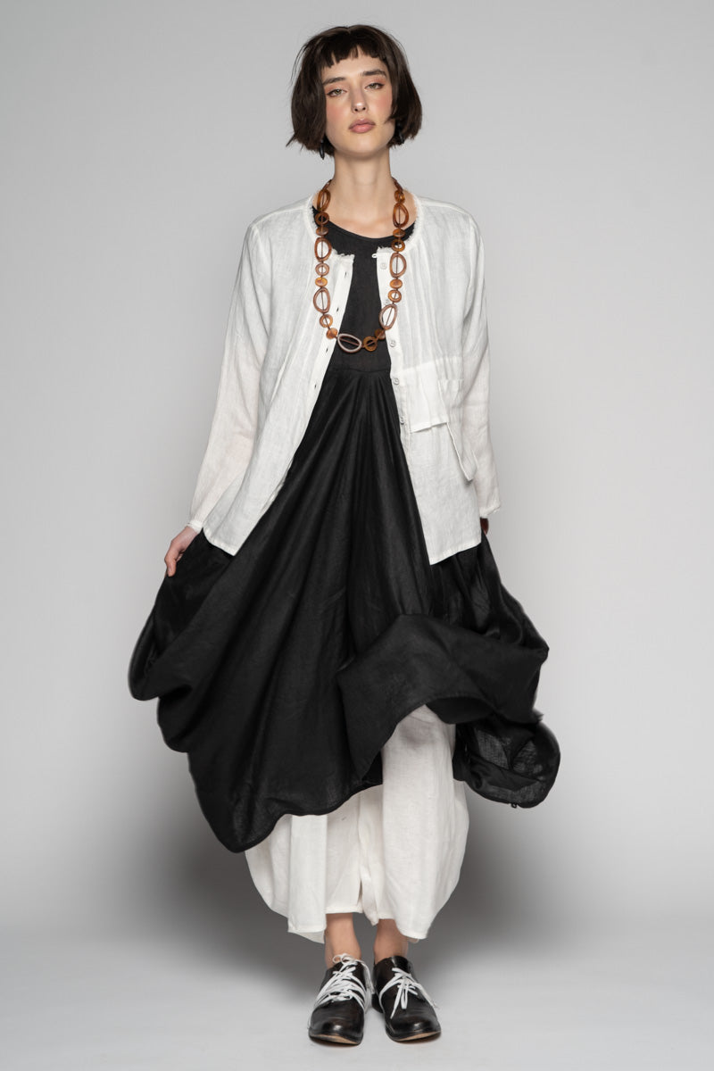 Softly structured and full of quiet movement, the Sabi Dress drifts between ease and sculpture. The soft linen fall into gentle folds, while draped pockets create a lived-in, artful volume.