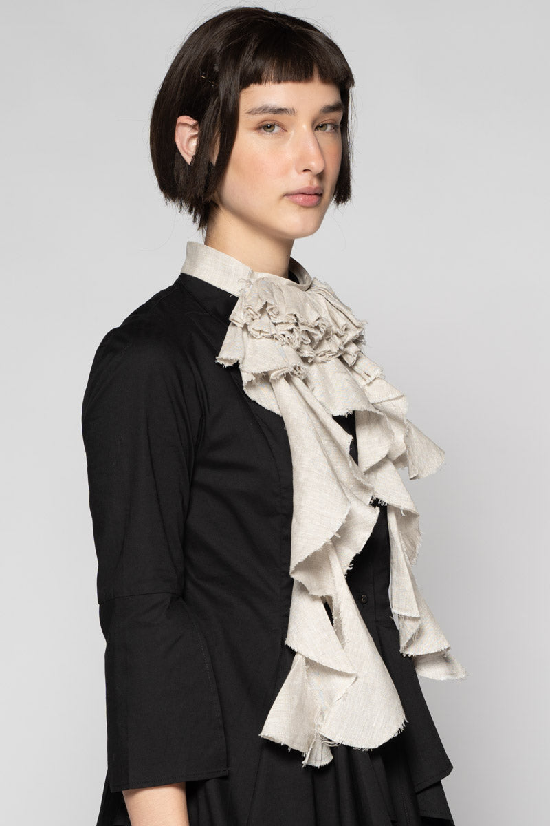 A nod to Elizabethan romance, the Sabi Frill brings quiet drama to modern dressing. Crafted from 100% linen with soft raw edges and layered ruffles, it evokes the elegance of bygone eras — reimagined for today’s wardrobe of texture and expression.