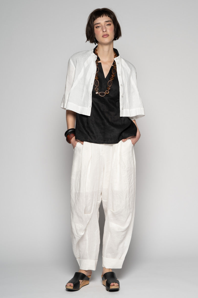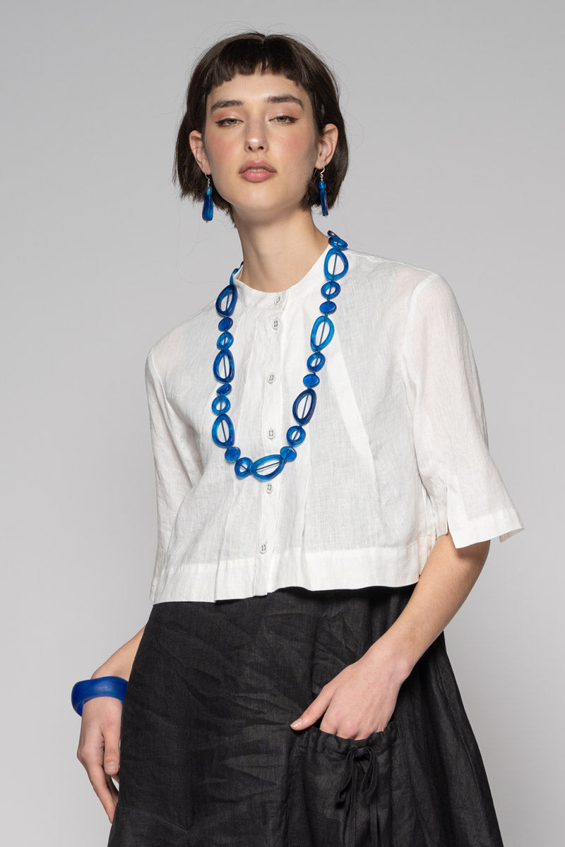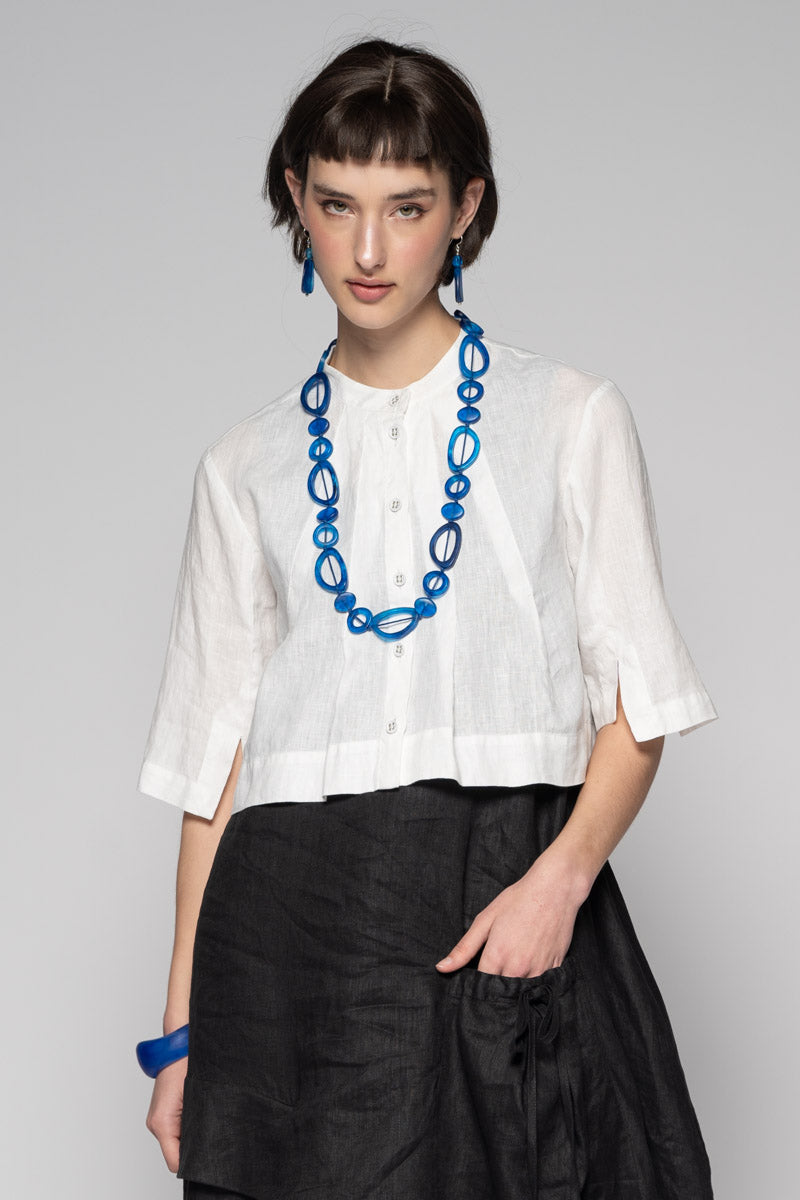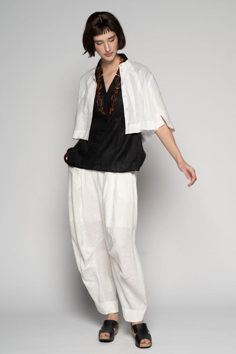 Fresh and light for spring, the Sabi Short Jacket brings gentle structure to soft layers. Tailored lines meet subtle asymmetry: a clean Mandarin collar, pleated front, and refined split cuffs create quiet interest without fuss. Wear it buttoned as a neat top or open as a light jacket—its cropped length sits beautifully over dresses and high-waist pants. Pair with the Sabi Tuck Dress or Ouna Pants for an easy, modern set.