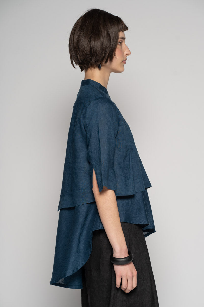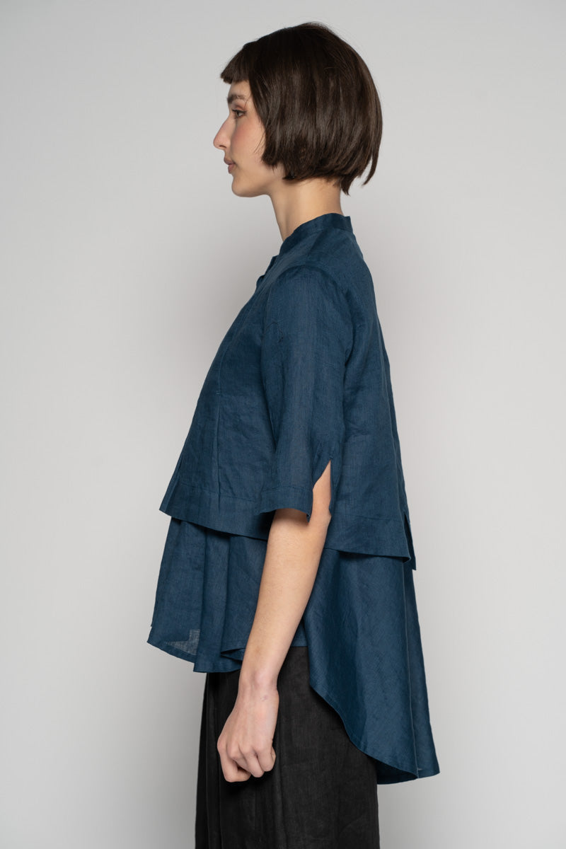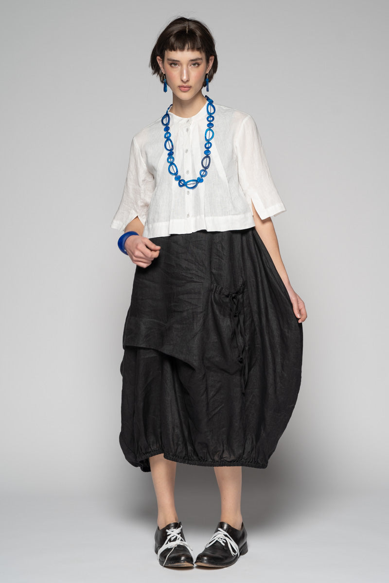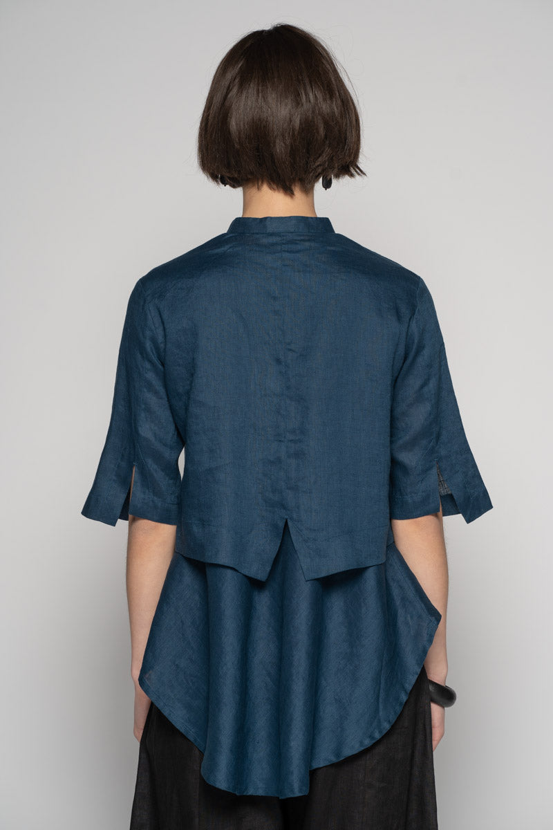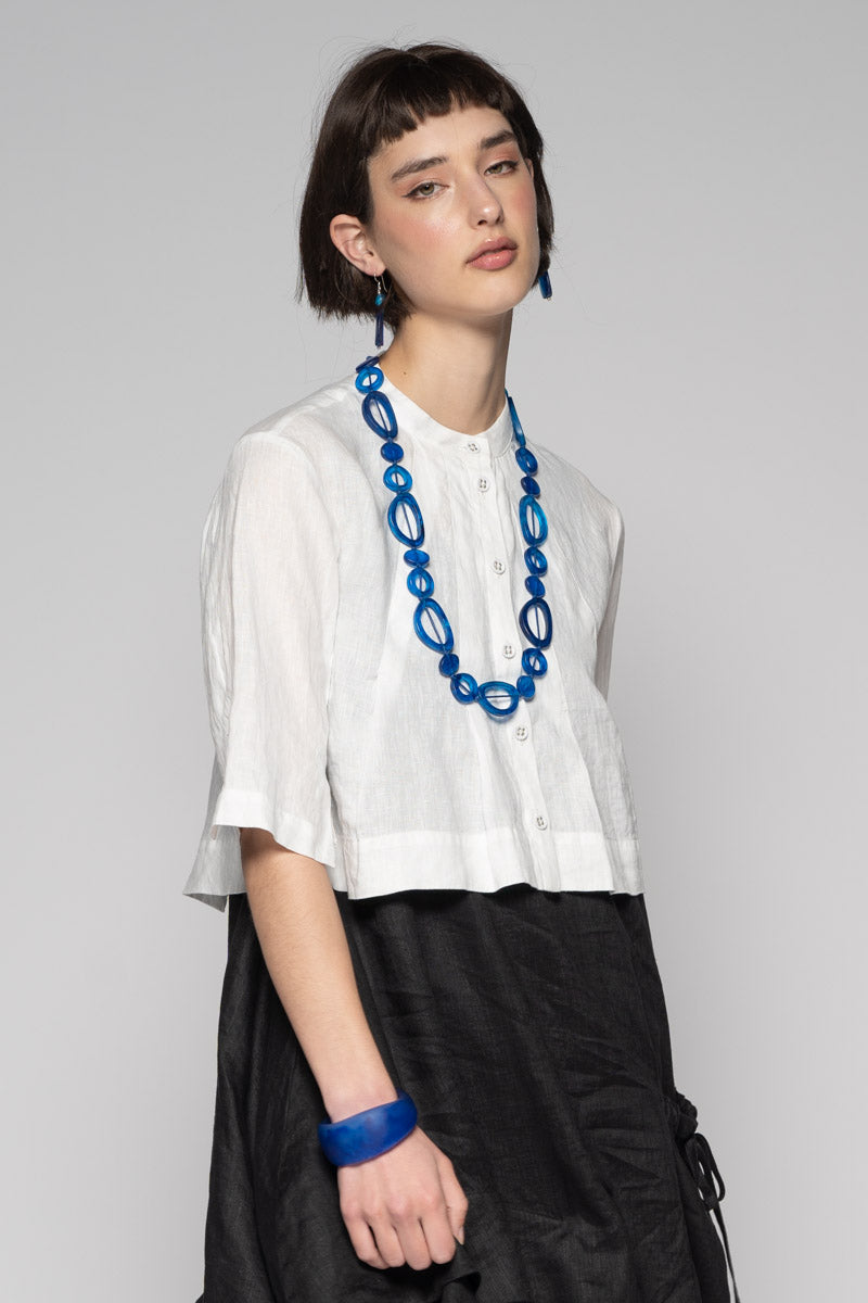 Fresh and light for spring, the Sabi Short Jacket brings gentle structure to soft layers. Tailored lines meet subtle asymmetry: a clean Mandarin collar, pleated front, and refined split cuffs create quiet interest without fuss. Wear it buttoned as a neat top or open as a light jacket—its cropped length sits beautifully over dresses and high-waist pants. Pair with the Sabi Tuck Dress or Ouna Pants for an easy, modern set.