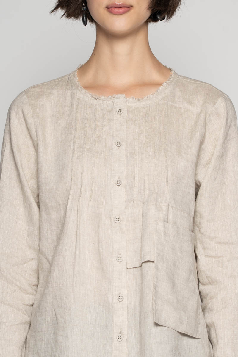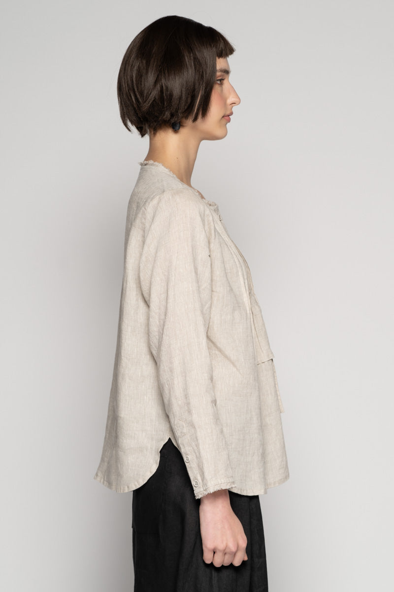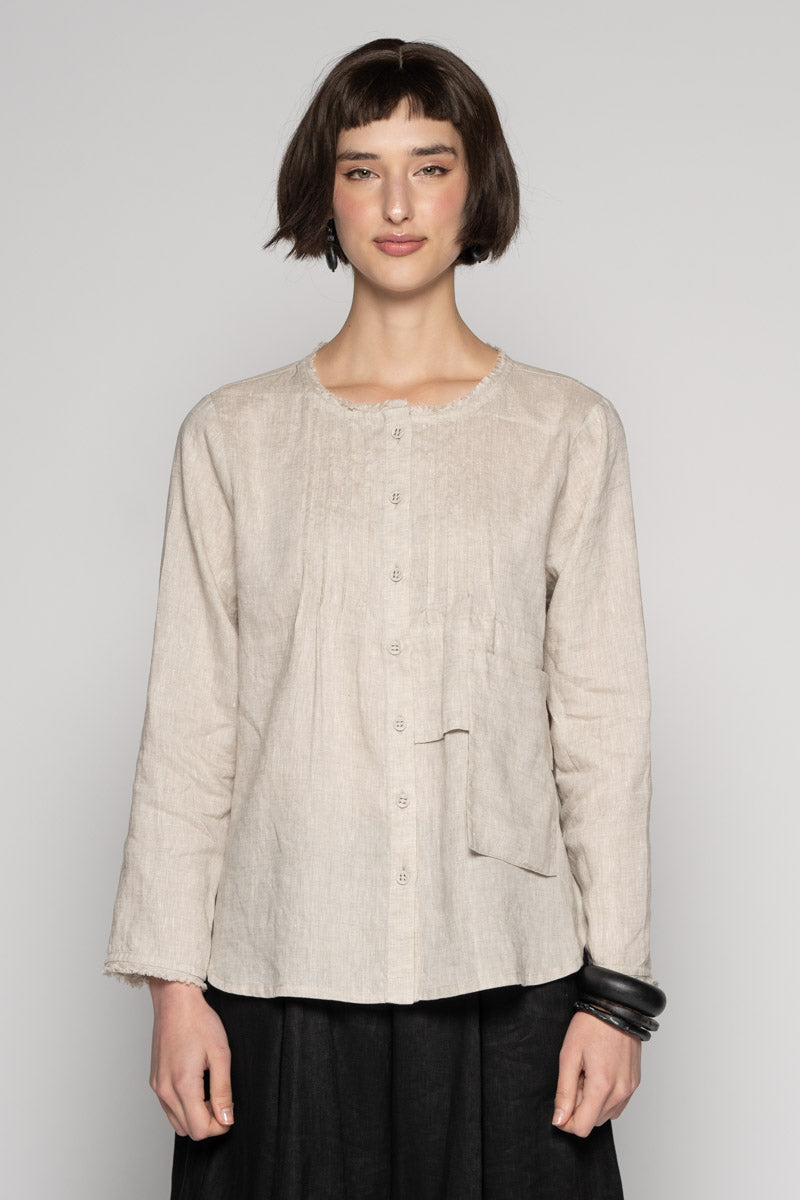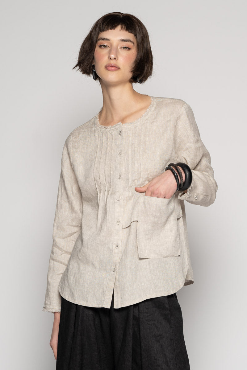 Breezy and unhurried, the Sabi Tuck Shirt carries the ease of countryside mornings. Soft, pre-washed linen skims the body, while fine pintucks at the front open into gentle gathers for a relaxed, feminine line. Hand-frayed edges trace the neckline and cuffs, and a delicate button-and-loop at the top front lets you wear it neatly closed or softly open. A layered patch pocket adds a subtle sculptural note, and a curved hem makes for effortless layering over trousers or skirts.