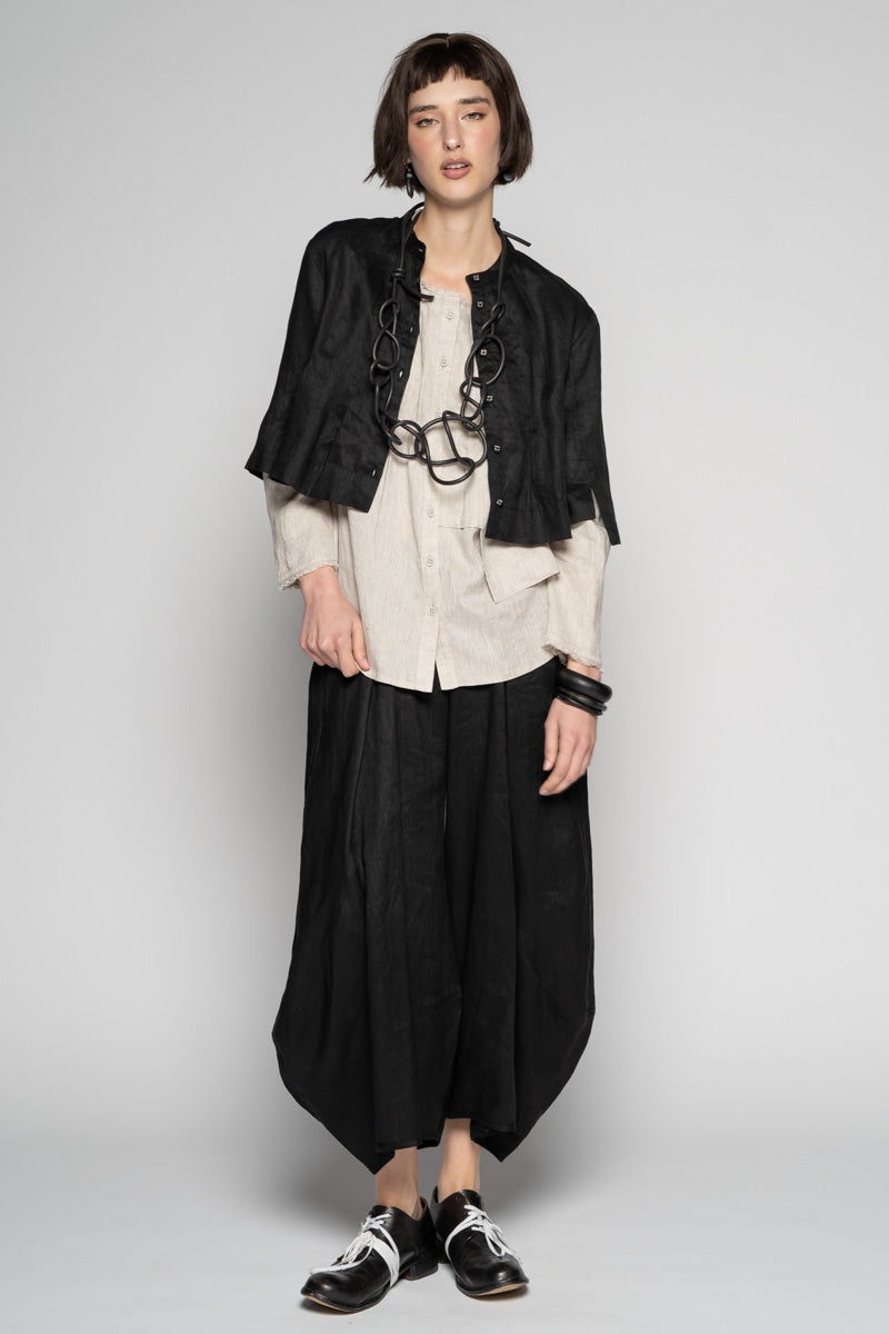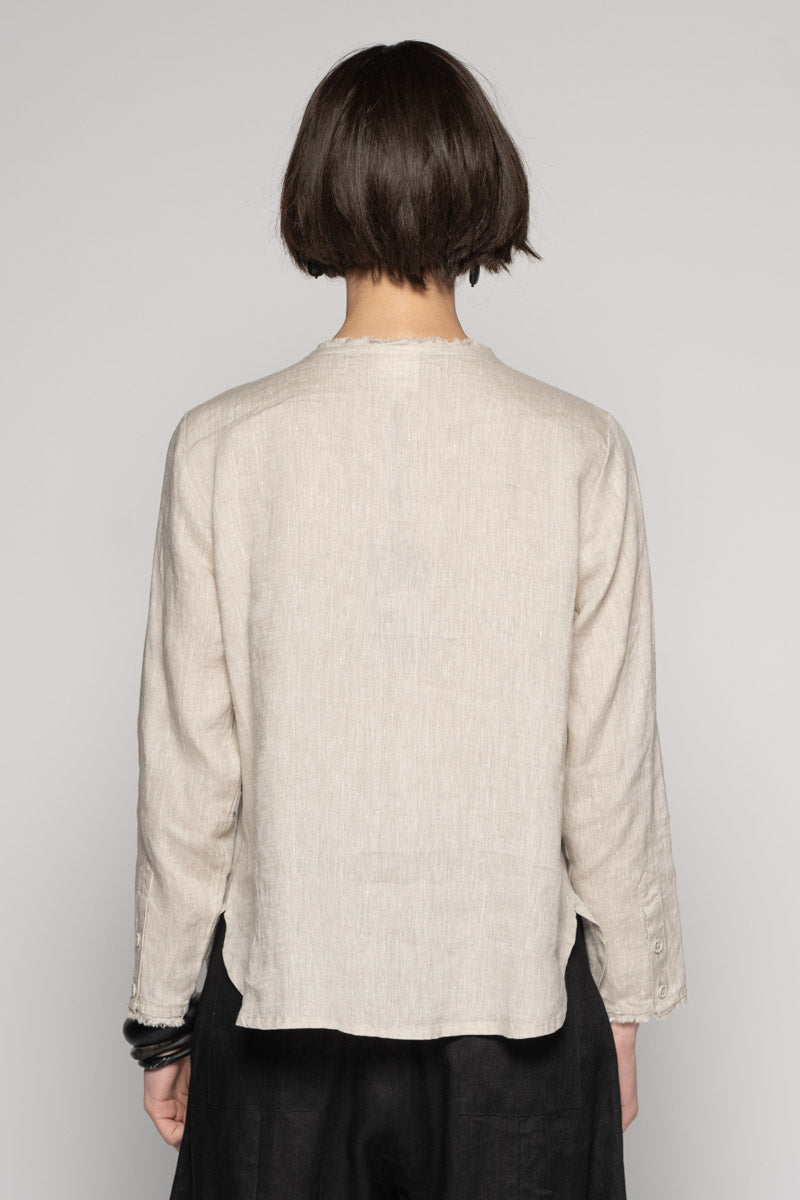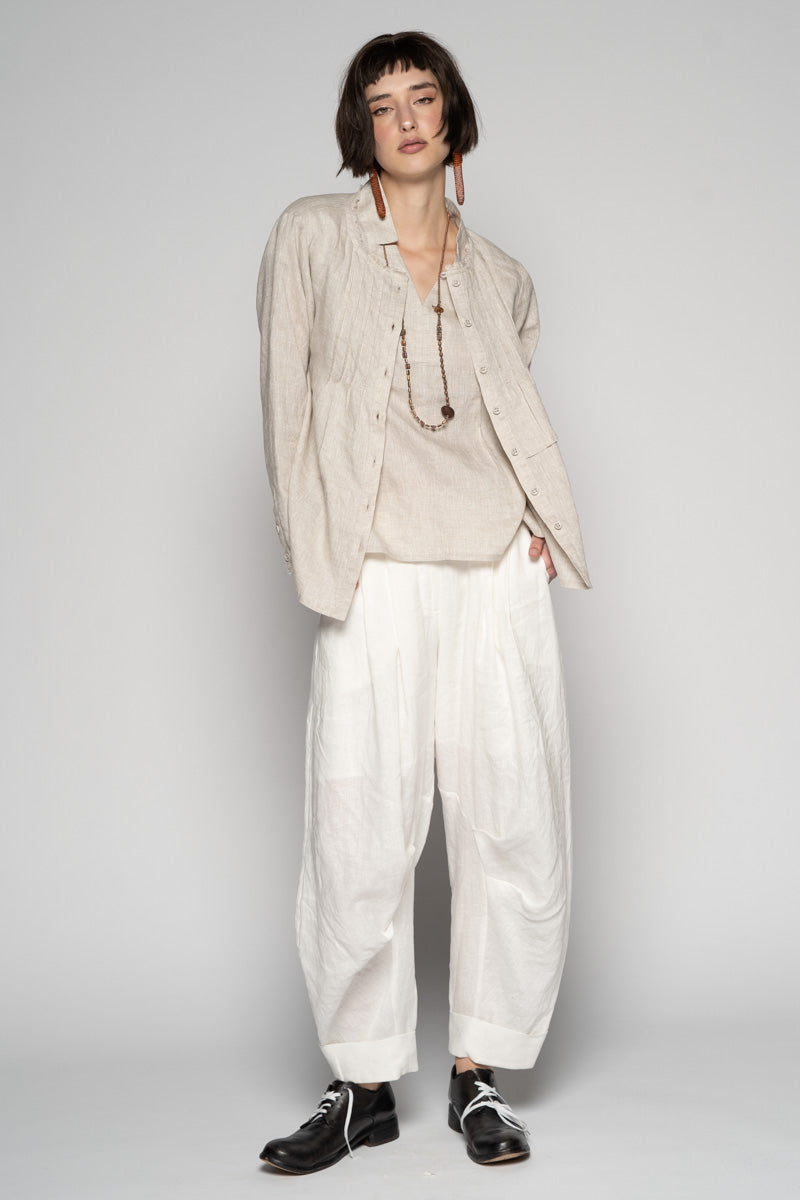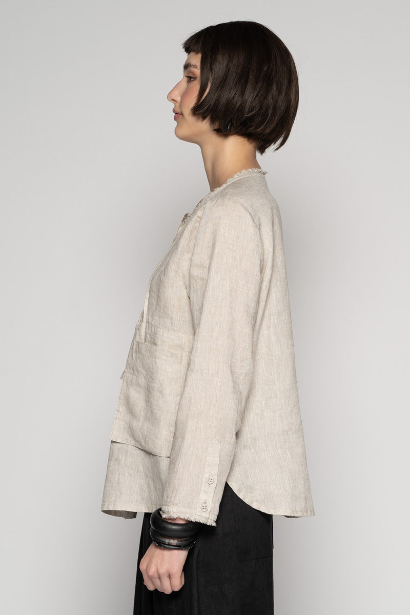 Breezy and unhurried, the Sabi Tuck Shirt carries the ease of countryside mornings. Soft, pre-washed linen skims the body, while fine pintucks at the front open into gentle gathers for a relaxed, feminine line. Hand-frayed edges trace the neckline and cuffs, and a delicate button-and-loop at the top front lets you wear it neatly closed or softly open. A layered patch pocket adds a subtle sculptural note, and a curved hem makes for effortless layering over trousers or skirts.