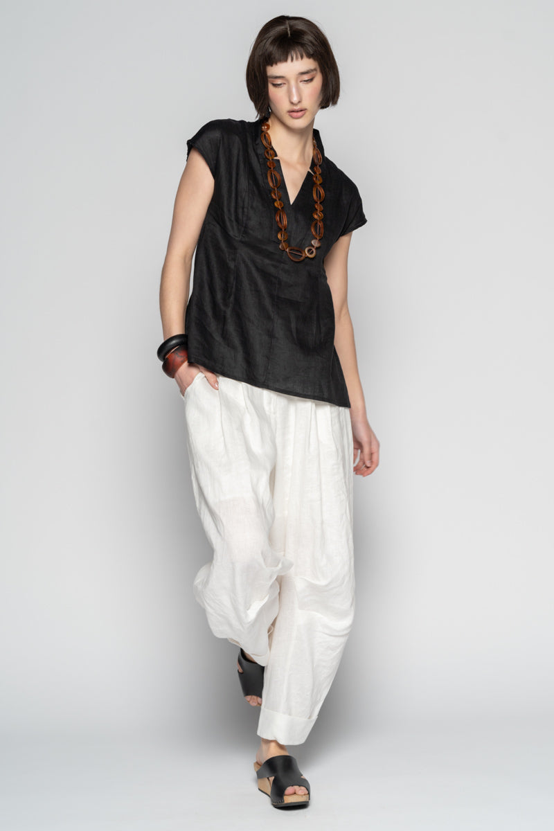 Quiet polish, easy breath. The Sabi V Top sharpens a simple tee into something quietly architectural: a soft stand collar that opens into a slim V, flanked by neat cut-out notches for a graphic touch. Cap sleeves skim the shoulder, and panelled seams carve gentle shape through the waist. Cut in cool, plain-weave linen, it dresses up or down—beautiful pressed or softly crushed.