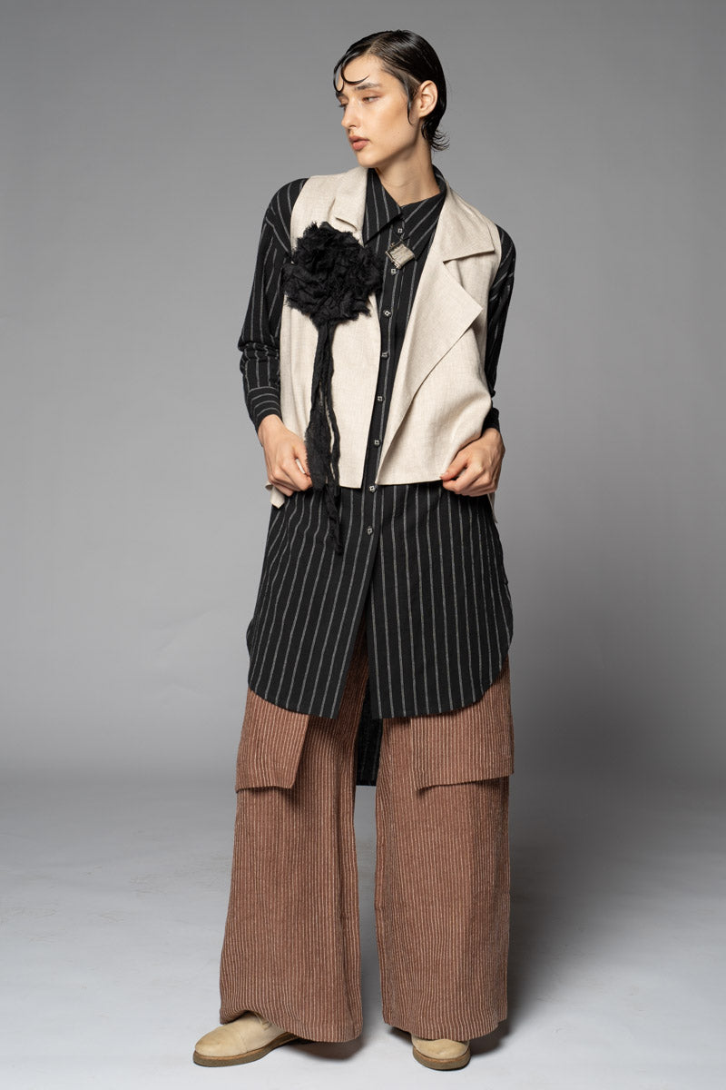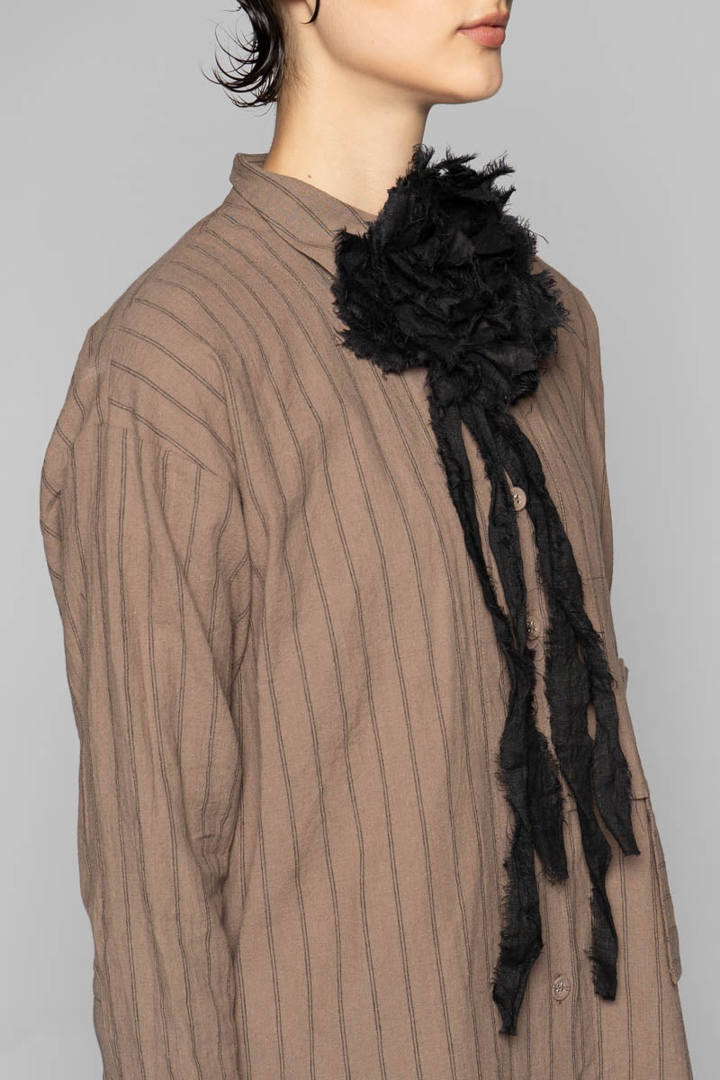 The Sancha Brooch is shaped from raw linen, its frayed edges left intentionally unfinished so the fabric may soften and evolve with time. Layered petals form an irregular bloom — imperfect, weightless, and quietly expressive — while long trailing strands fall freely, moving with the body like loose threads of memory.