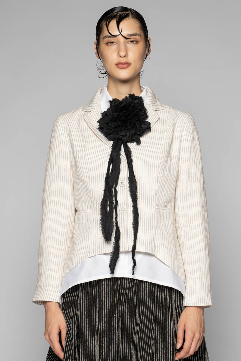 Worn at the collar or resting against a vest, it becomes less an ornament and more a gesture — a small act of softness placed against structured form. Each movement reveals new shadows, new texture, a fleeting sense of romance grounded in restraint.