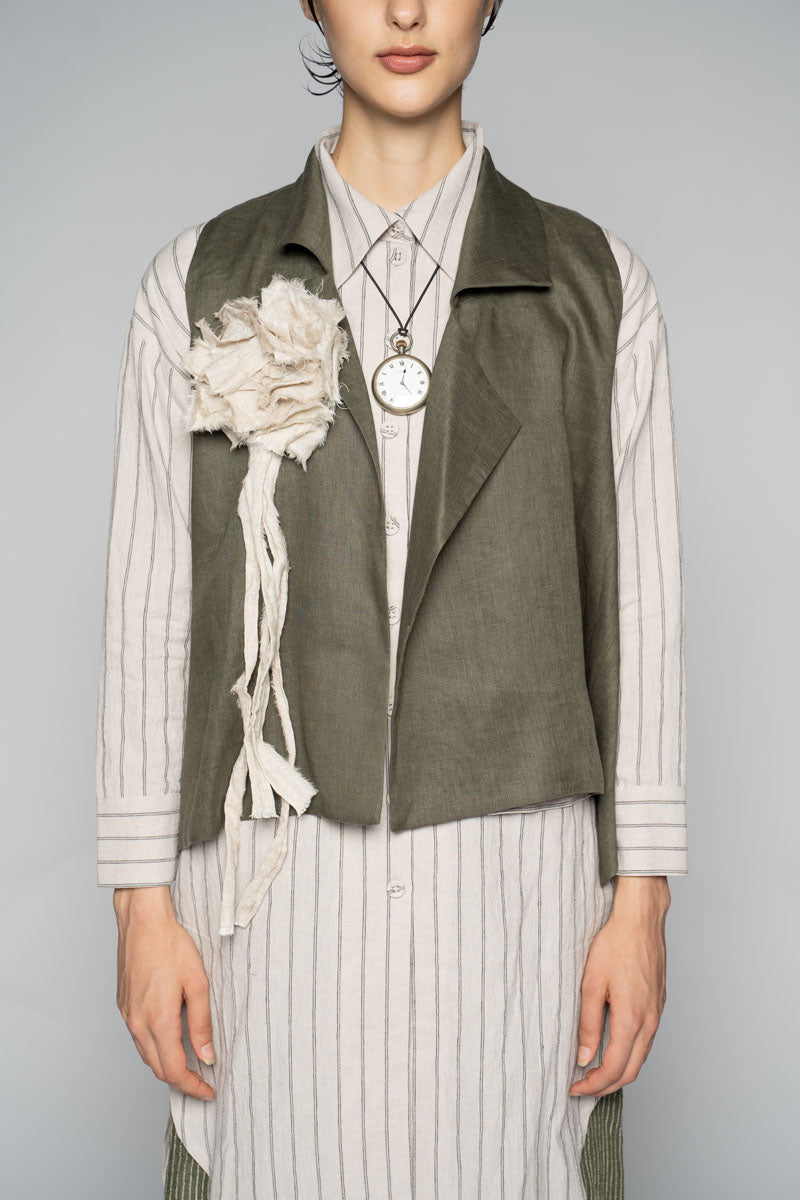 The Sancha Brooch is shaped from raw linen, its frayed edges left intentionally unfinished so the fabric may soften and evolve with time. Layered petals form an irregular bloom — imperfect, weightless, and quietly expressive — while long trailing strands fall freely, moving with the body like loose threads of memory.