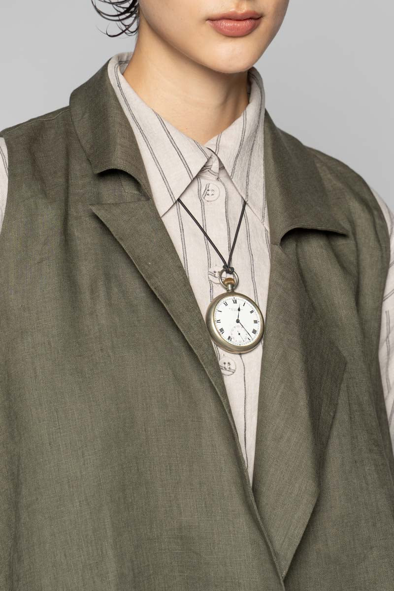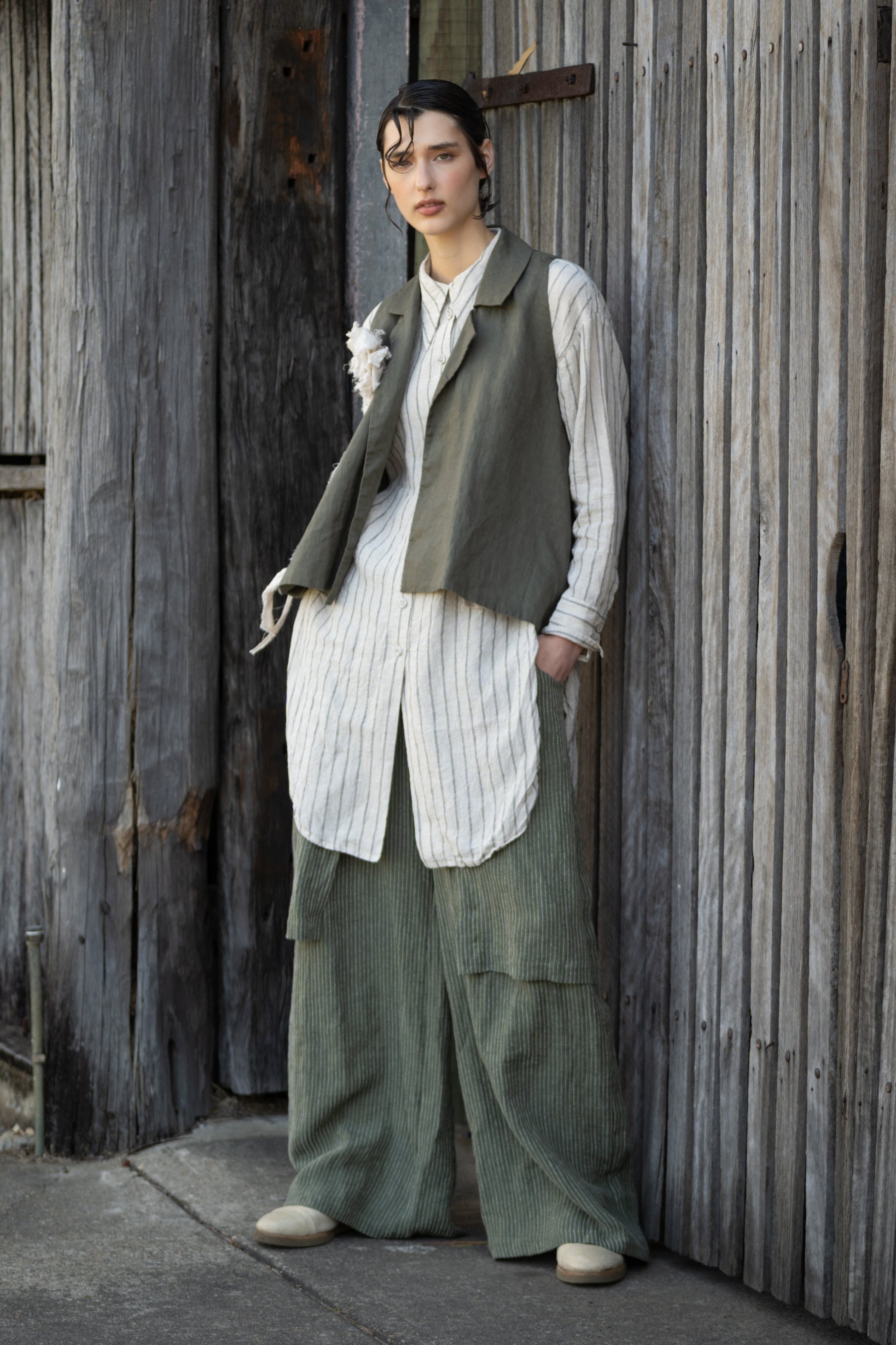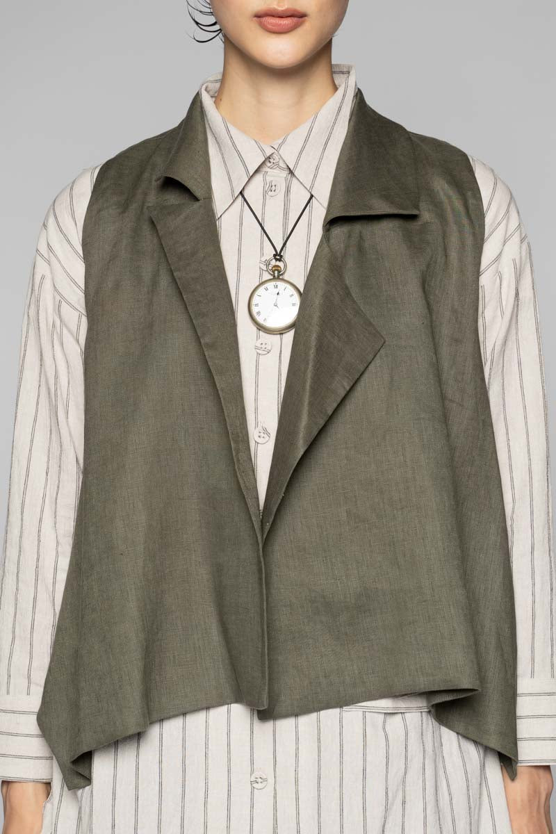 Cut from pure linen, the Sancha Vest carries an effortless quiet strength — a piece that feels both lived-in and intentional. The asymmetrical lapel falls softly across the body, forming gentle architectural lines that shift with movement, balancing structure with ease.