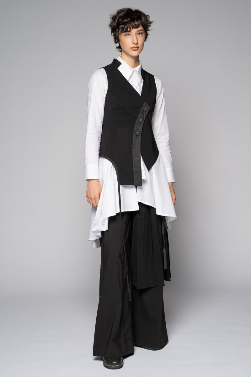 A study in asymmetry and control. The Sia Vest cuts across the body in deliberate angles, creating tension between line and drape. Long straps fall with intention, allowing the silhouette to shift depending on how it is fastened. Large buttons anchor the form, adding weight and balance to the piece.