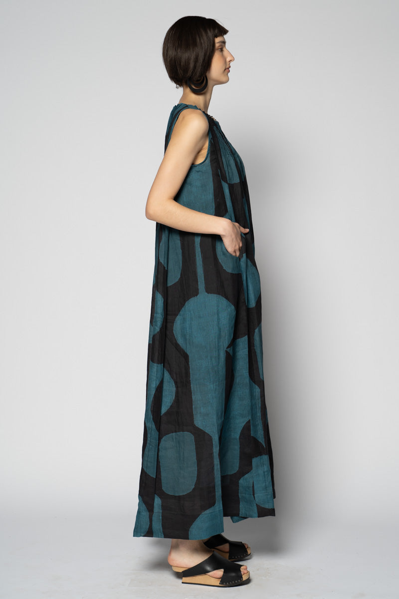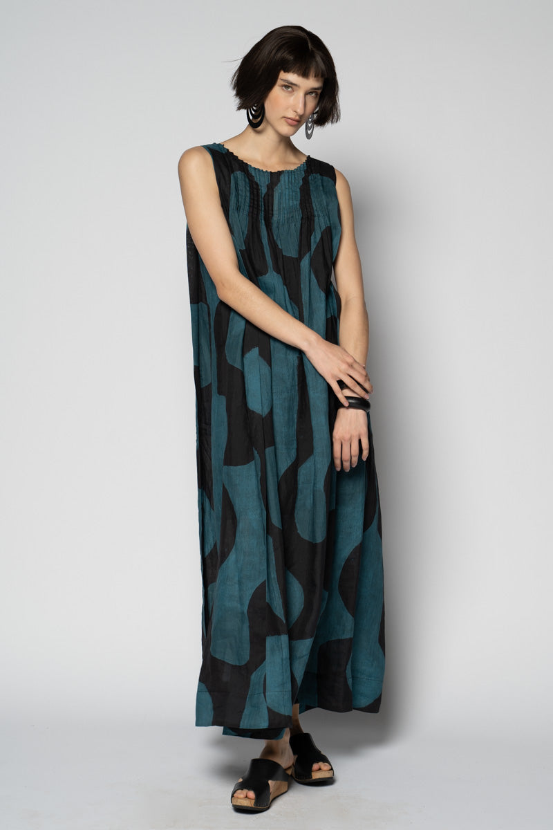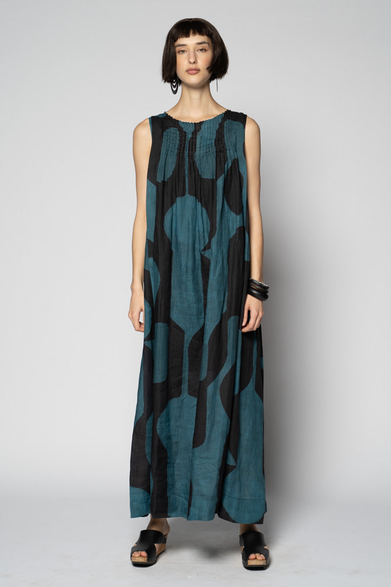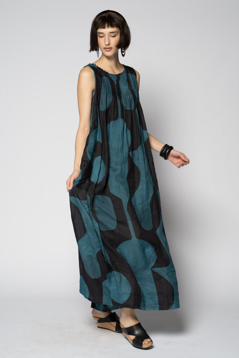 The Sumika Pin Dress is cut in breathable 100% ramie and printed with Sally’s softly drawn vessel forms, bringing quiet art to everyday wear. Fine pintucks frame the neckline and open into an easy, fluid fall; the sleeveless cut skims the shoulders neatly while deep side pockets add practicality. Light, airy and effortless, it slips on and drapes beautifully—equally at home with simple slides or layered under a jacket.