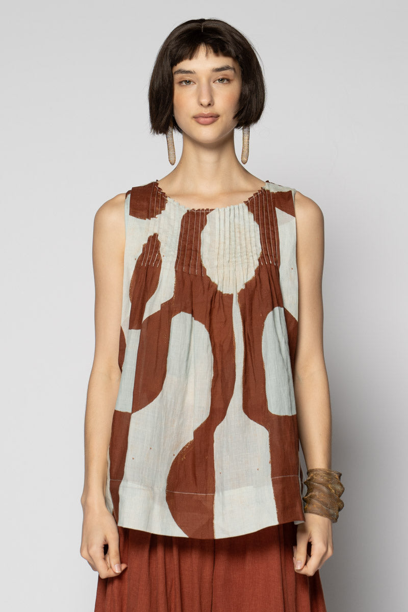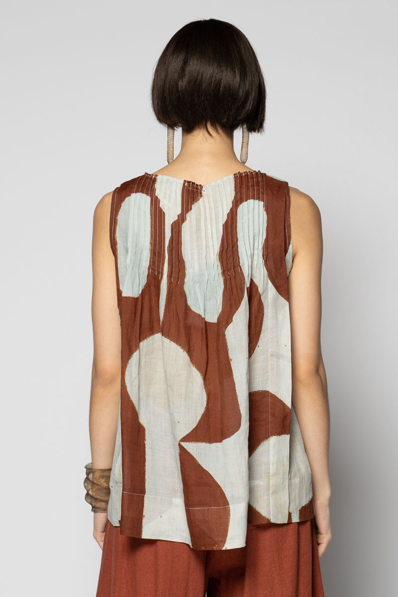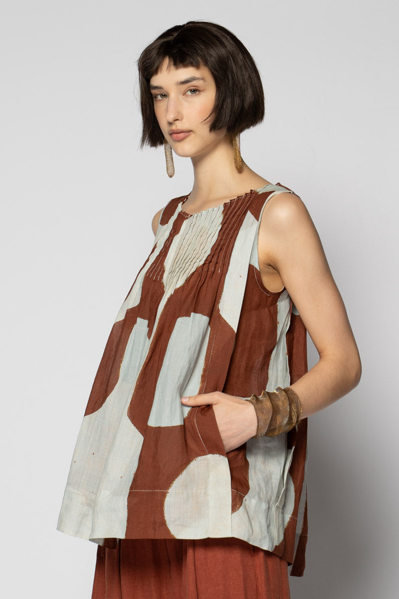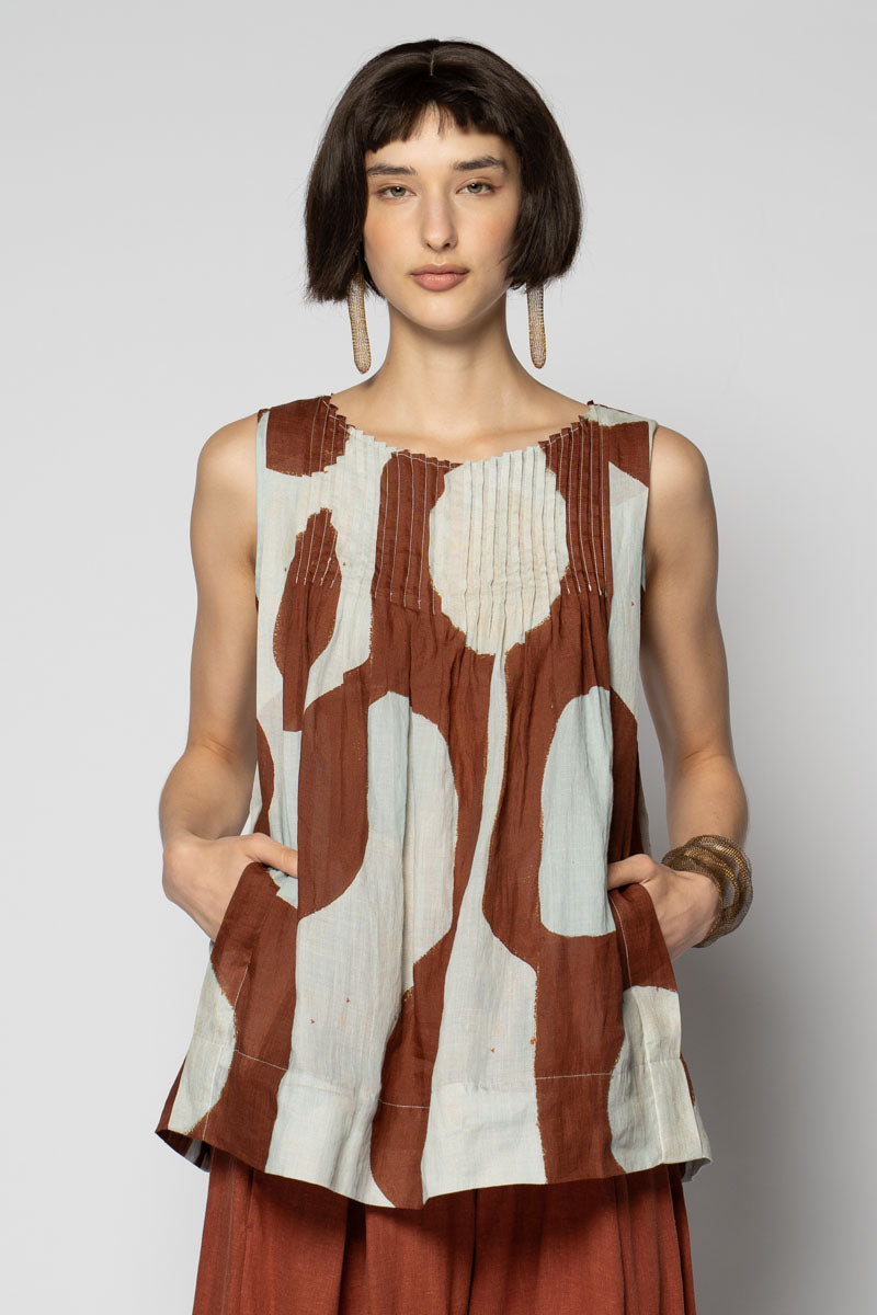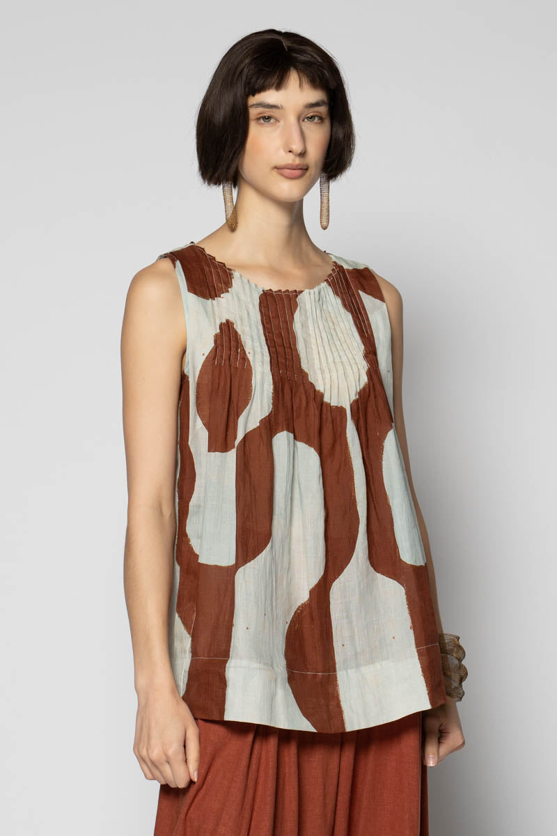 An artful whisper for everyday. The Sumika Pin Top is cut from breathable 100% ramie and printed with Sally Barling’s softly drawn vessel forms—quiet shapes that move with the light. Fine pintucks trace the neckline front and back, releasing into a gentle A-line swing that floats over the body. Sleeveless and easy to slip on, it drapes beautifully over wide pants or layered with skirts for effortless texture.