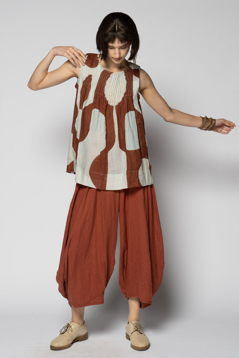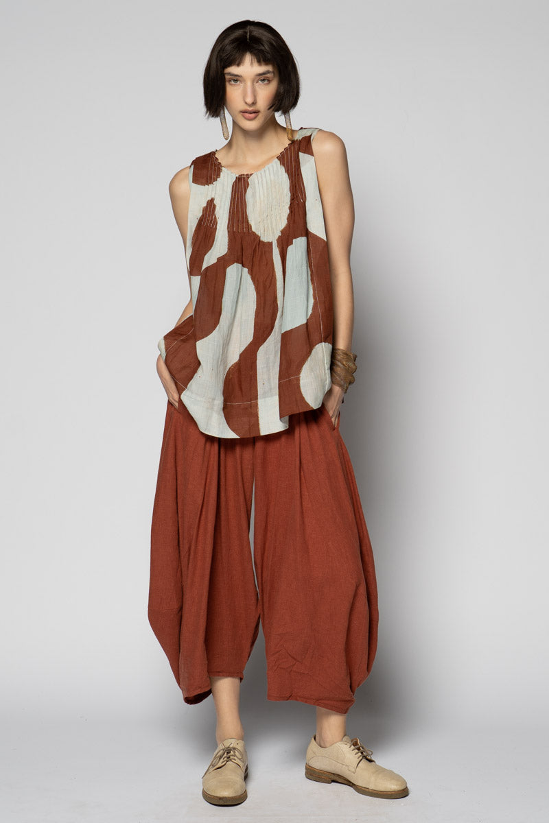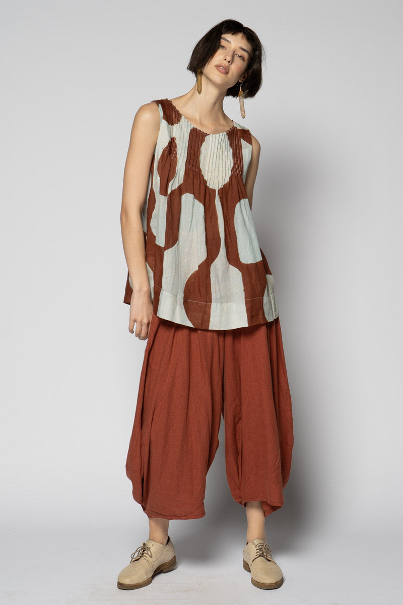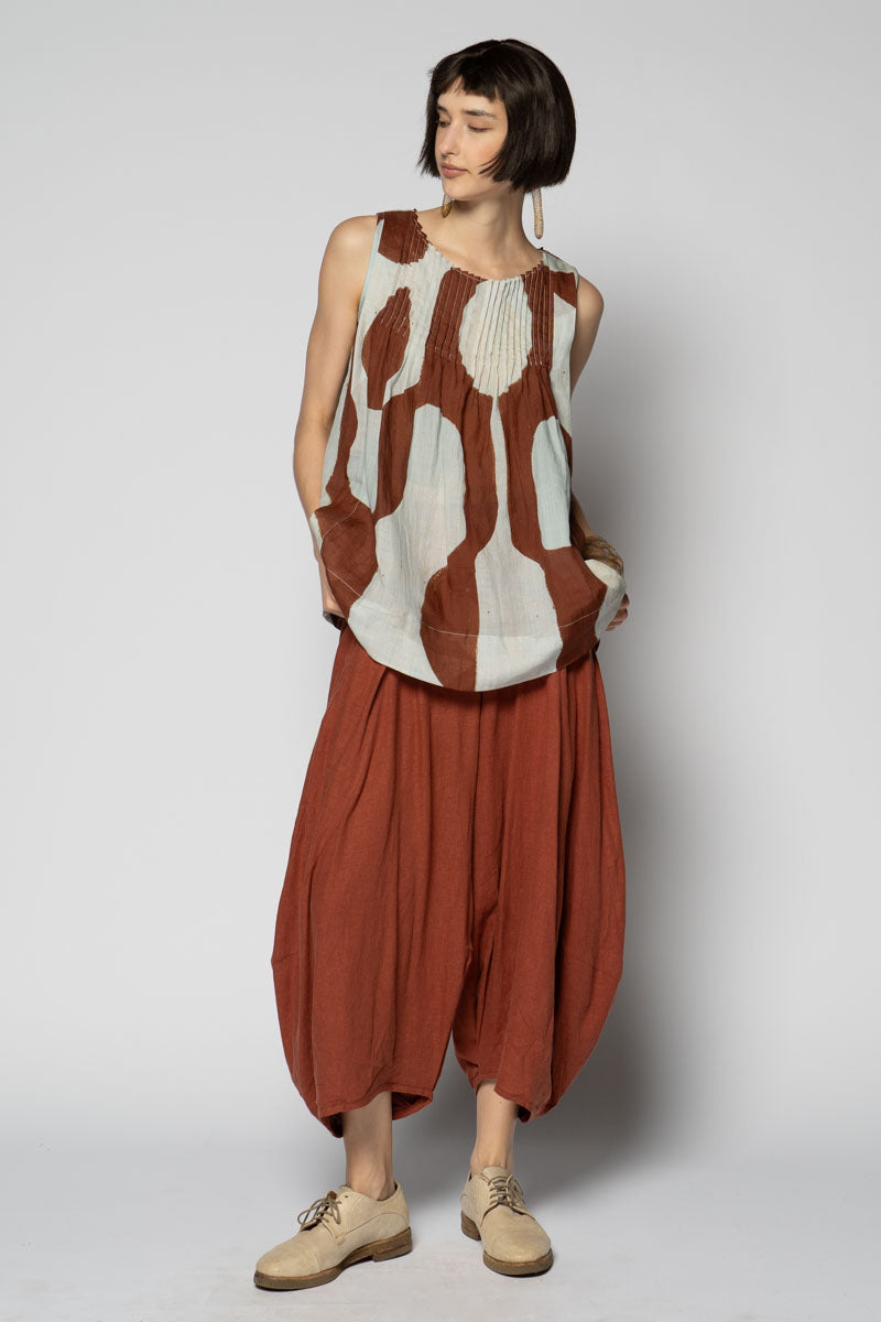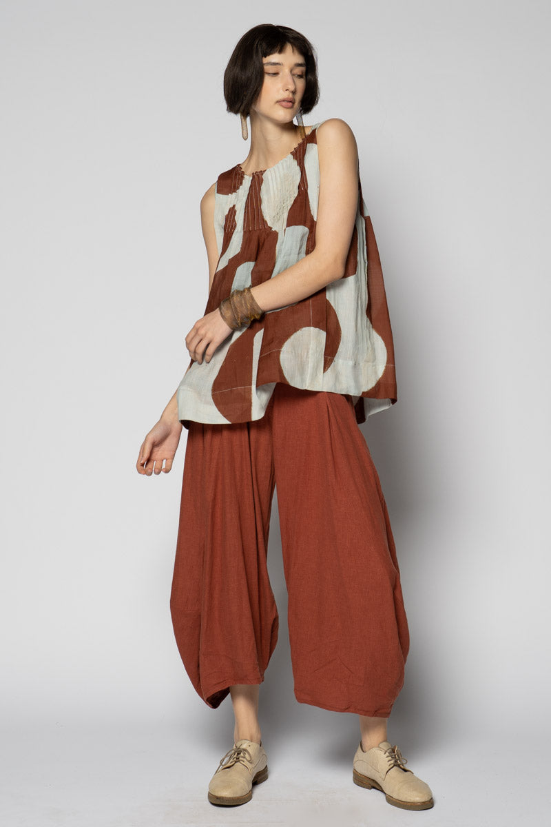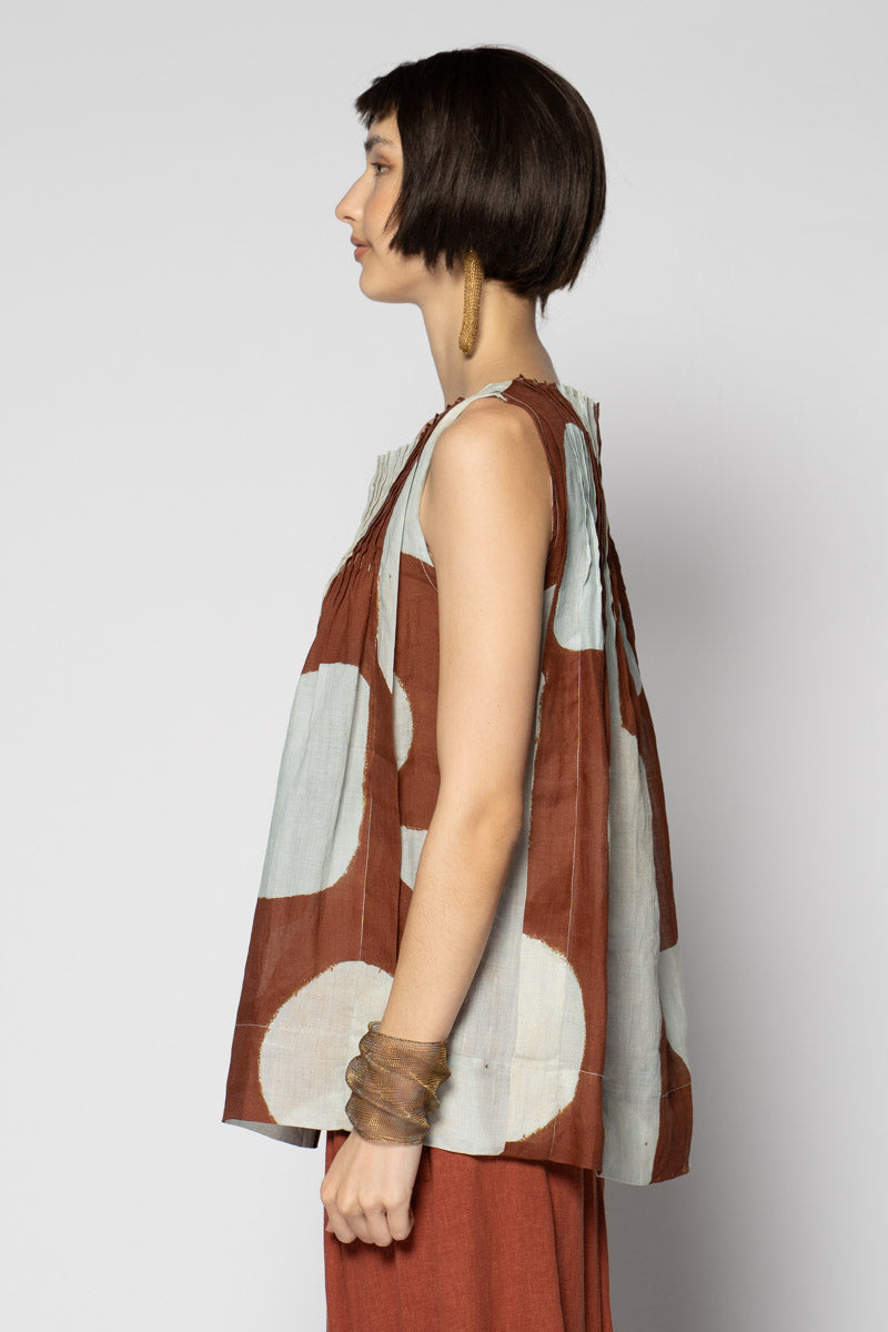 An artful whisper for everyday. The Sumika Pin Top is cut from breathable 100% ramie and printed with Sally Barling’s softly drawn vessel forms—quiet shapes that move with the light. Fine pintucks trace the neckline front and back, releasing into a gentle A-line swing that floats over the body. Sleeveless and easy to slip on, it drapes beautifully over wide pants or layered with skirts for effortless texture.