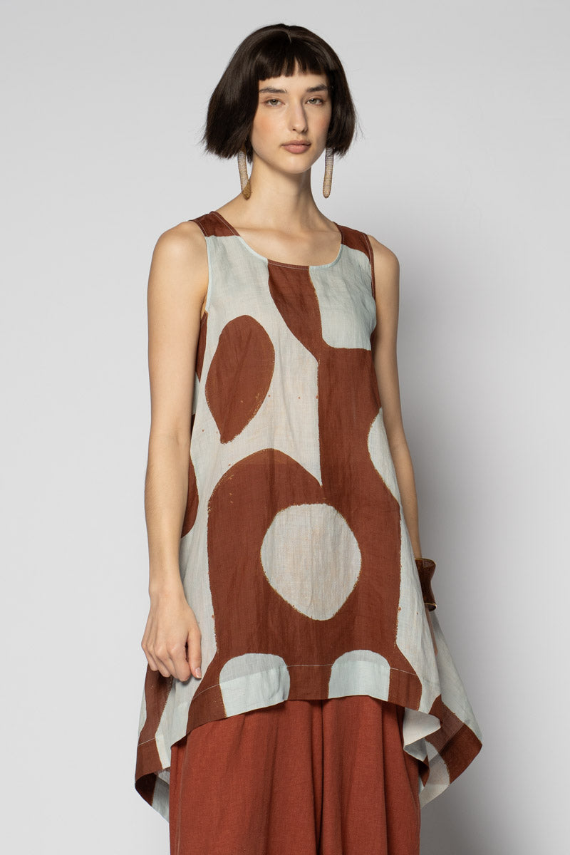 An easy layer with beautiful movement. The Sumika Tunic is cut from feather-light 100% ramie—a natural fibre with a cool, dry hand—and printed with Sally Barling’s softly drawn vessel forms. The silhouette skims from a neat scoop neckline into a gentle A-line that floats over skirts or wide pants. Breezy for warm days and effortless to layer year-round, it’s a quiet staple that brings art into everyday dressing.