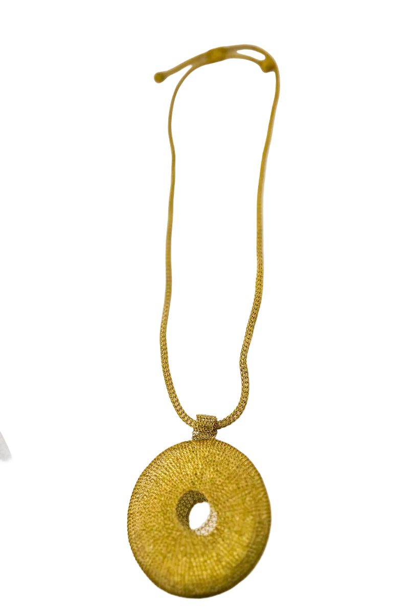 The Taiyo Necklace is a sculptural circle of light, woven entirely from fine metal mesh in a warm muted gold. A hollow, sun-disk pendant is built from layers of knitted mesh, creating beautiful texture and gentle volume without the weight of a solid piece. The matching mesh cord threads seamlessly through the top of the pendant and finishes with two rounded ends and a sliding loop, allowing you to adjust the length from a high collarbone sit to a longer, meditative drop.