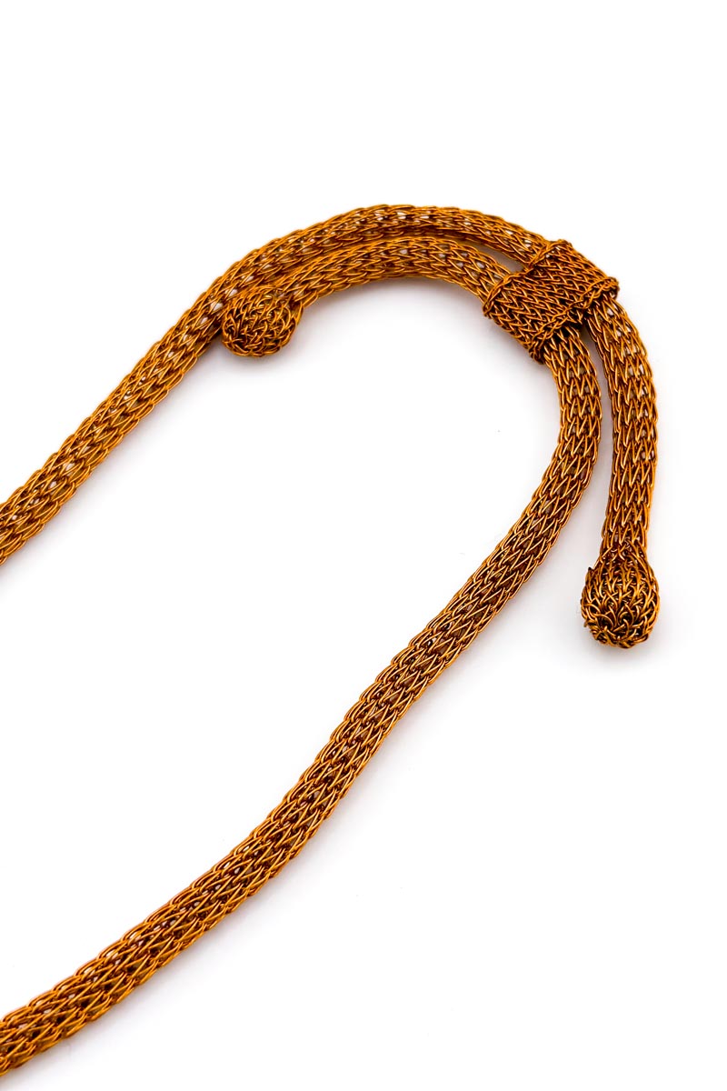 The Taiyo Necklace is a sculptural circle of light, woven entirely from fine metal mesh in a warm muted gold. A hollow, sun-disk pendant is built from layers of knitted mesh, creating beautiful texture and gentle volume without the weight of a solid piece. The matching mesh cord threads seamlessly through the top of the pendant and finishes with two rounded ends and a sliding loop, allowing you to adjust the length from a high collarbone sit to a longer, meditative drop.