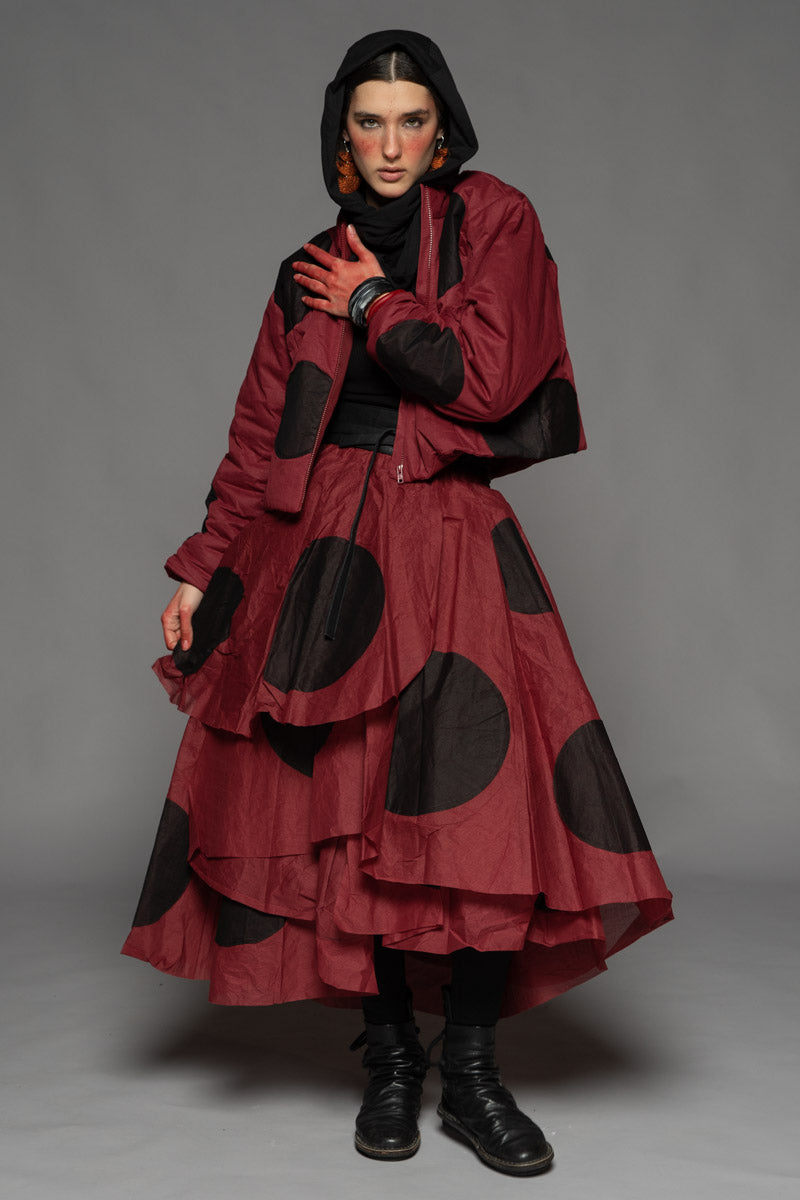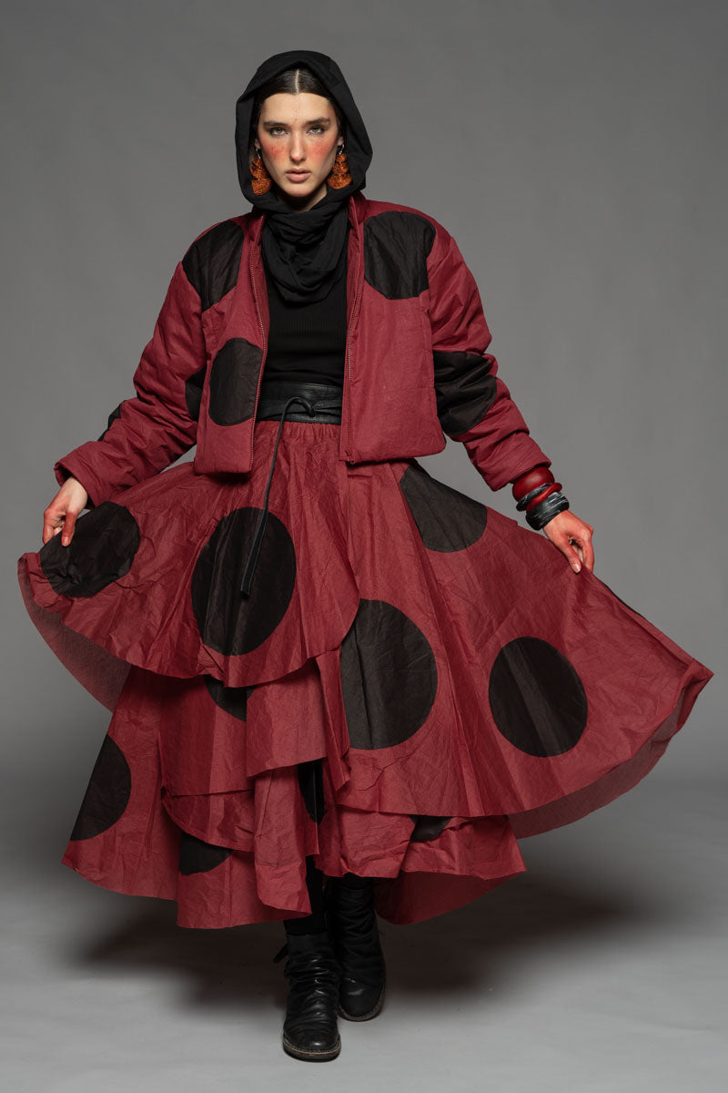 The whimsical float of a ladybird, caught mid-flight on a warm breeze, inspires the playful spirit of the Tentou Dot Skirt. The 100% cotton organdie composition rustles with an airy elegance - a fabric that holds memory in its draping folds. Paired with a 100% cotton lining and a fully elasticated waist, the skirt features asymmetrical layers that cascade into a voluminous, petal-shaped silhouette. Bold black patches punctuate the skirt’s surface, echoing the iconic dots of a ladybird’s wings - a subtle nod to nature’s charm and quiet delight. Available in three striking colour ways, the skirt pairs perfectly with the Tentou Puffer Jacket.