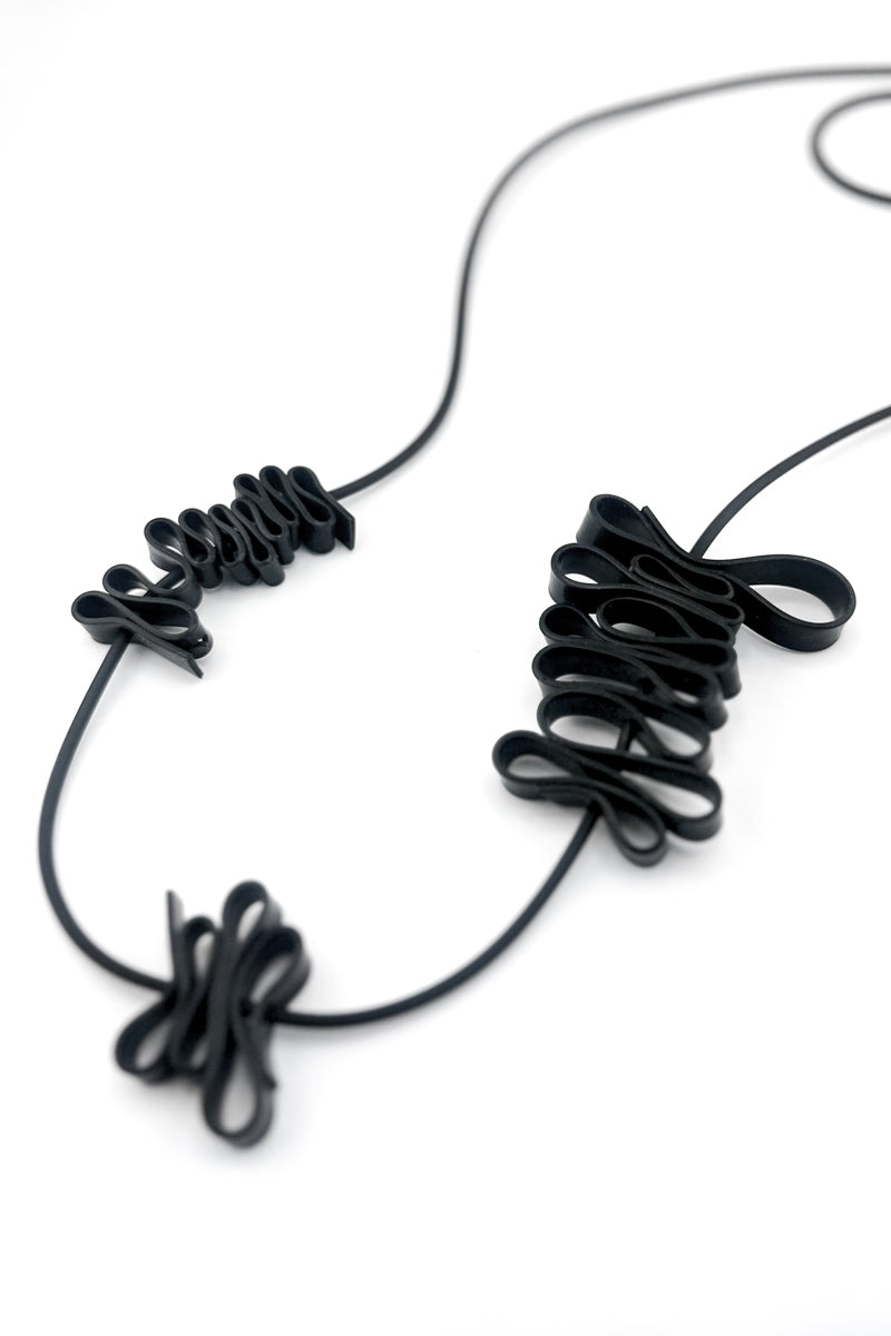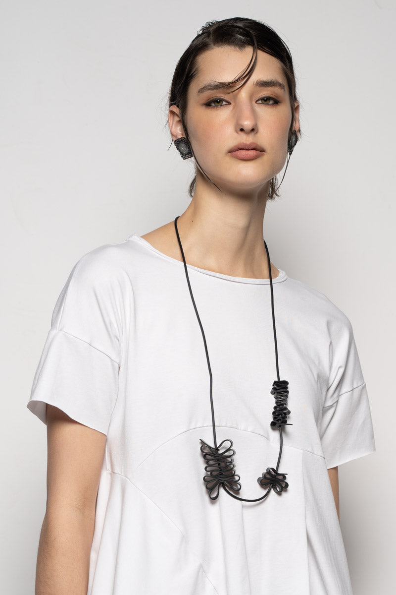 A modern nod to tradition, the Mini Obi Necklace takes its cue from the flowing grace of the kimono obi. Lightweight rubber links drape softly and move with you, while sliding rubber elements let you shape the piece—short and sculptural or long and fluid—whenever the mood shifts. Effortless to wear, endlessly adjustable.