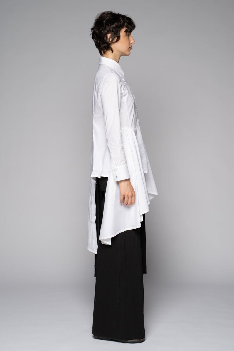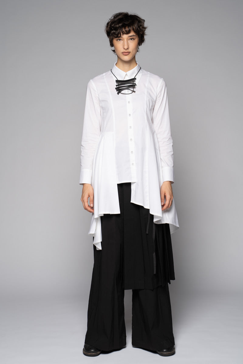 Precision meets movement in the Wano Long Shirt. A sharp collar and clean button line frame the body, while sculpted paneling through the waist releases into an asymmetric fall. The silhouette shifts as you move — structured at the front, fluid at the side and back.