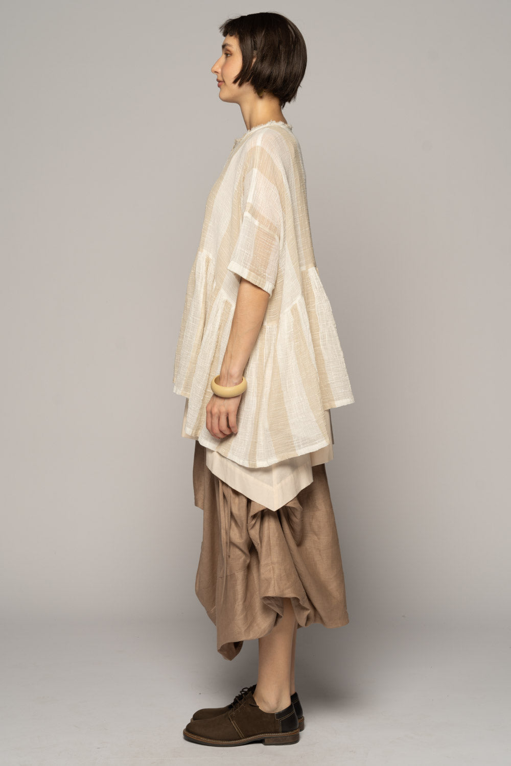 Airy and light, the Wattle Gather Top drifts softly around the body in sun-washed stripes. An oversized, swing silhouette falls from a gathered seam under the bust, creating gentle movement and ease. The neckline is softly frayed with a brass button placket and a top button-and-loop closure, and relaxed short sleeves that skim rather than cling. Made from an open-weave 100% cotton, it’s breezy over a cami and effortless for warm days.