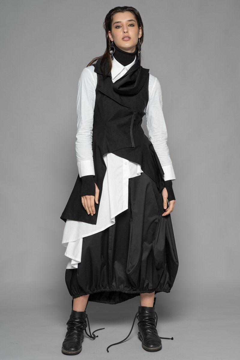 Biker-chic meets business with the Zero Tunic. It is a daring merging of punk and corporate styles. Designed to be layered, this trans-seasonal piece will transform and create a bold statement with its structured neckline (which can be styled up or down) and asymmetrical hem. With nods to 90s grunge, the 70s mod-revival era and gangster pinstripes of the 20s, the Zero Tunic remains a timeless garment. It can be styled over a T-shirt, skivvy or collared shirt (pictured here with the Gozen shirt), and looks fantastic paired with the Soryo Skirt, Shuffle Skirt or Shuffle Pants. Give your favourite outfit a cool urban edge and indulge in the compliments which will follow!